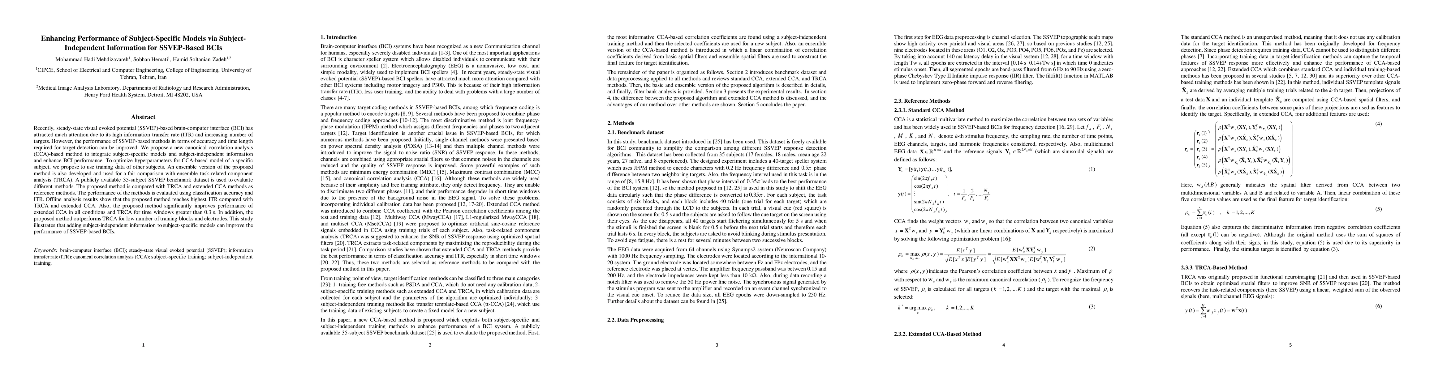This paper proposes a method to enhance the performance of SSVEP-based BCIs by integrating subject-specific models with subject-independent information using canonical correlation analysis (CCA). The method outperforms existing techniques in terms of information transfer rate and classification accuracy, demonstrating the benefits of combining diverse training data.