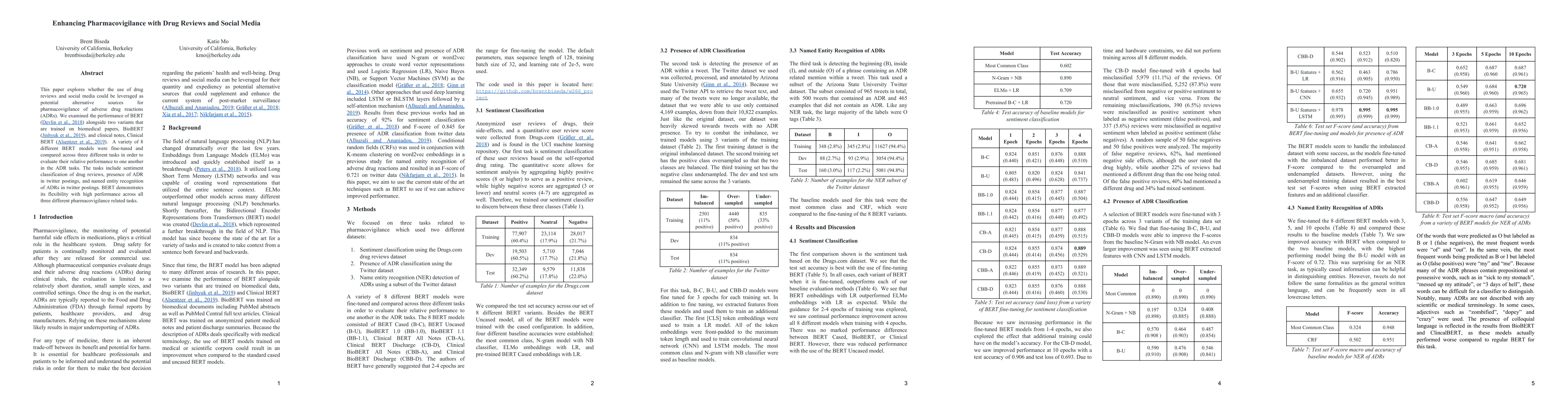 This paper explores whether the use of drug reviews and social media could be leveraged as potential alternative sources for pharmacovigilance of adverse drug reactions (ADRs). We examined the performance of BERT alongside two variants that are trained on biomedical papers, BioBERT7, and clinical notes, Clinical BERT8. A variety of 8 different BERT models were fine-tuned and compared across three different tasks in order to evaluate their relative performance to one another in the ADR tasks. The tasks include sentiment classification of drug reviews, presence of ADR in twitter postings, and named entity recognition of ADRs in twitter postings. BERT demonstrates its flexibility with high performance across all three different pharmacovigilance related tasks.