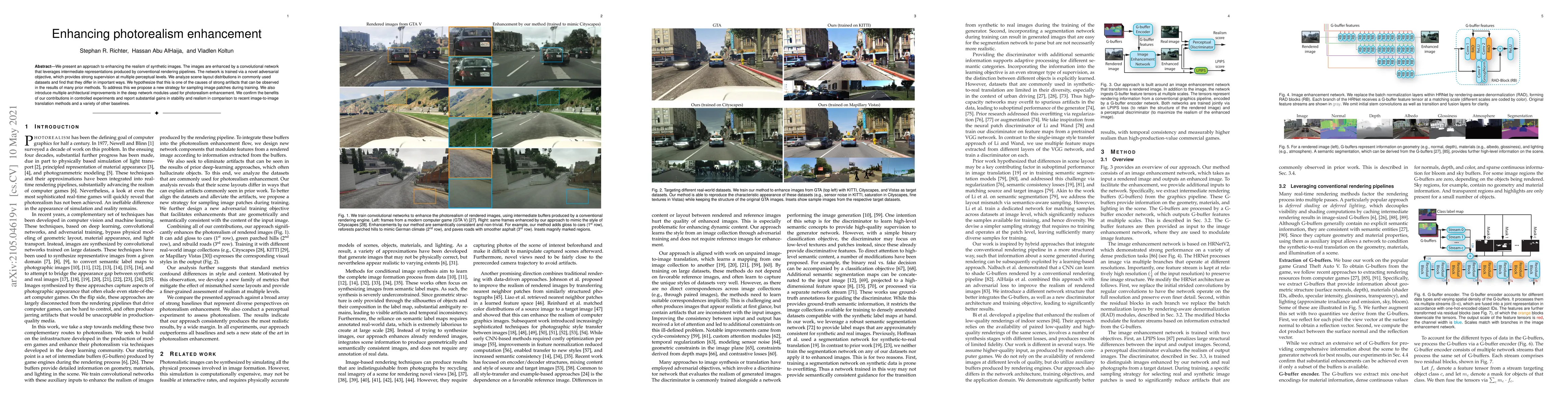 We present an approach to enhancing the realism of synthetic images. The images are enhanced by a convolutional network that leverages intermediate representations produced by conventional rendering pipelines. The network is trained via a novel adversarial objective, which provides strong supervision at multiple perceptual levels. We analyze scene layout distributions in commonly used datasets and find that they differ in important ways. We hypothesize that this is one of the causes of strong artifacts that can be observed in the results of many prior methods. To address this we propose a new strategy for sampling image patches during training. We also introduce multiple architectural improvements in the deep network modules used for photorealism enhancement. We confirm the benefits of our contributions in controlled experiments and report substantial gains in stability and realism in comparison to recent image-to-image translation methods and a variety of other baselines.