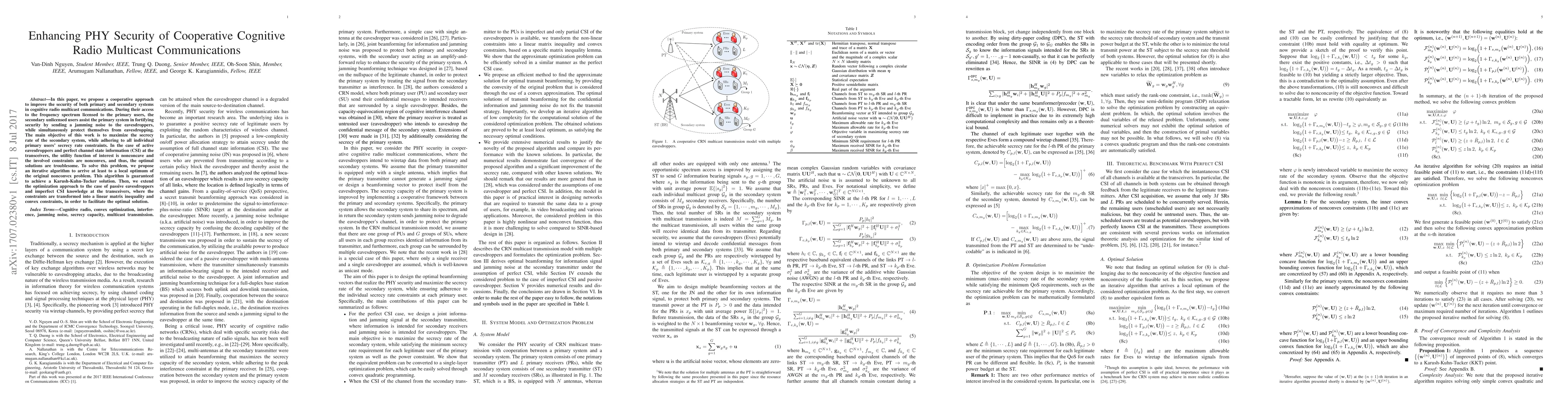 This paper proposes a cooperative security approach for cognitive radio multicast communications, where secondary users aid primary users in thwarting eavesdroppers while safeguarding their own transmissions. The method tackles non-concave utility functions and non-convex constraints via an iterative algorithm, ensuring a Karush-Kuhn-Tucker solution. It further extends to passive eavesdroppers and imperfect CSI knowledge, transforming constraints into convex forms for optimal solutions.
