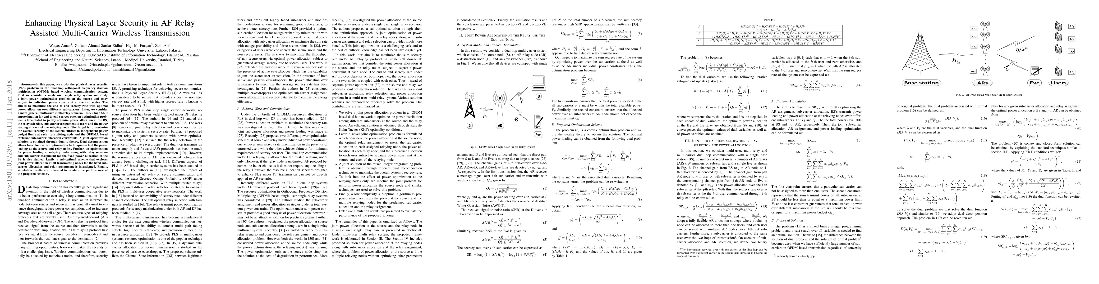 This paper investigates physical layer security in AF relay assisted multi-carrier wireless transmission, focusing on optimizing power allocation to maximize end-to-end secrecy rate. It explores both single-user and multi-user scenarios, employing joint optimization techniques and duality theory for secure communication under power constraints.