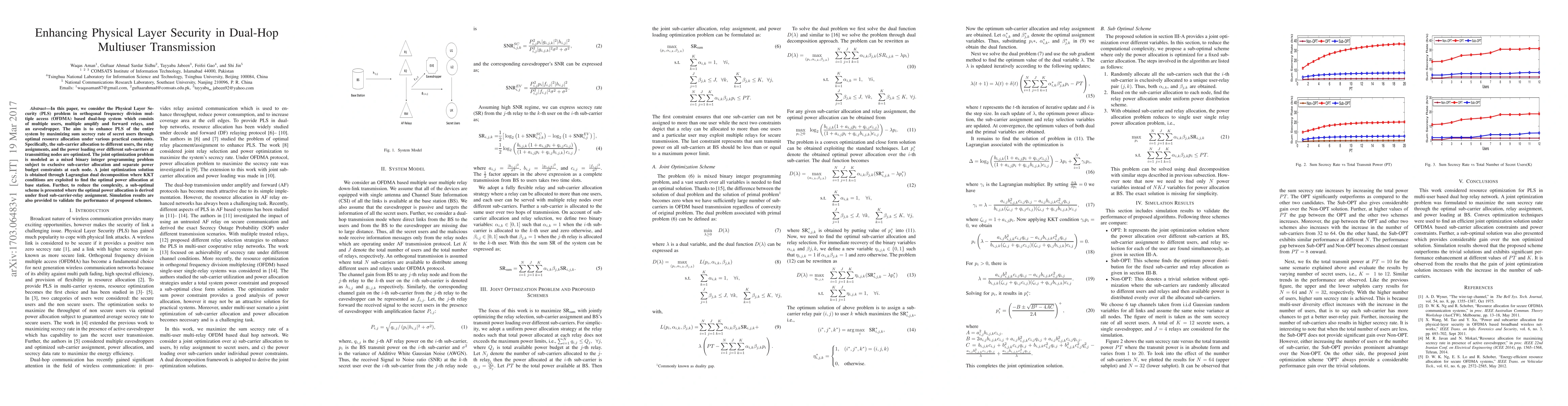 This paper enhances Physical Layer Security in dual-hop multiuser transmission by optimizing resource allocation to maximize secrecy rate for multiple users while considering practical constraints. The proposed scheme achieves a sub-optimal solution with reduced complexity.