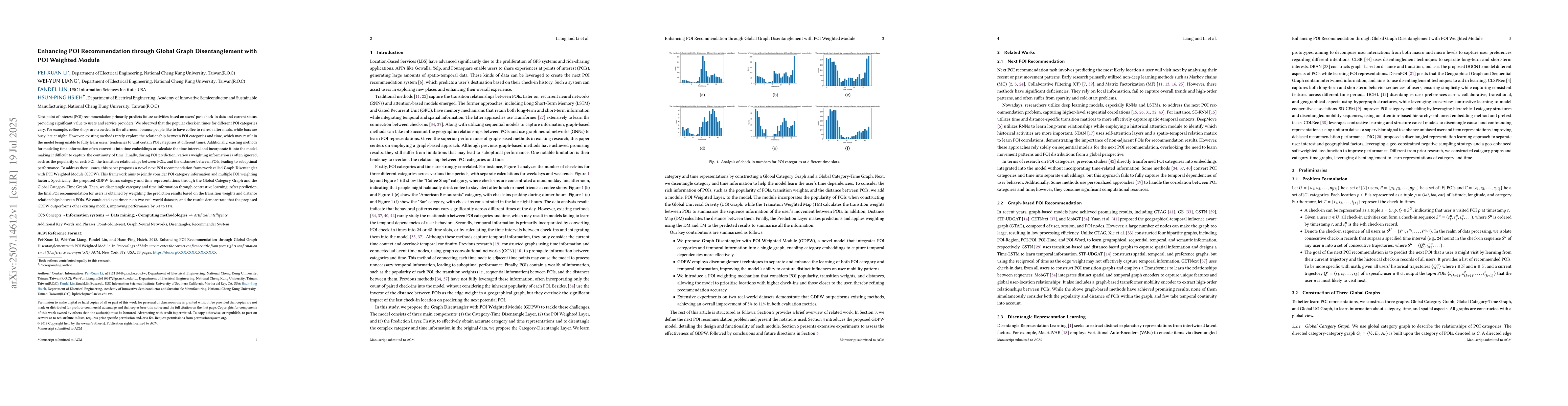 Next point of interest (POI) recommendation primarily predicts future activities based on users' past check-in data and current status, providing significant value to users and service providers. We observed that the popular check-in times for different POI categories vary. For example, coffee shops are crowded in the afternoon because people like to have coffee to refresh after meals, while bars are busy late at night. However, existing methods rarely explore the relationship between POI categories and time, which may result in the model being unable to fully learn users' tendencies to visit certain POI categories at different times. Additionally, existing methods for modeling time information often convert it into time embeddings or calculate the time interval and incorporate it into the model, making it difficult to capture the continuity of time. Finally, during POI prediction, various weighting information is often ignored, such as the popularity of each POI, the transition relationships between POIs, and the distances between POIs, leading to suboptimal performance. To address these issues, this paper proposes a novel next POI recommendation framework called Graph Disentangler with POI Weighted Module (GDPW). This framework aims to jointly consider POI category information and multiple POI weighting factors. Specifically, the proposed GDPW learns category and time representations through the Global Category Graph and the Global Category-Time Graph. Then, we disentangle category and time information through contrastive learning. After prediction, the final POI recommendation for users is obtained by weighting the prediction results based on the transition weights and distance relationships between POIs. We conducted experiments on two real-world datasets, and the results demonstrate that the proposed GDPW outperforms other existing models, improving performance by 3% to 11%.