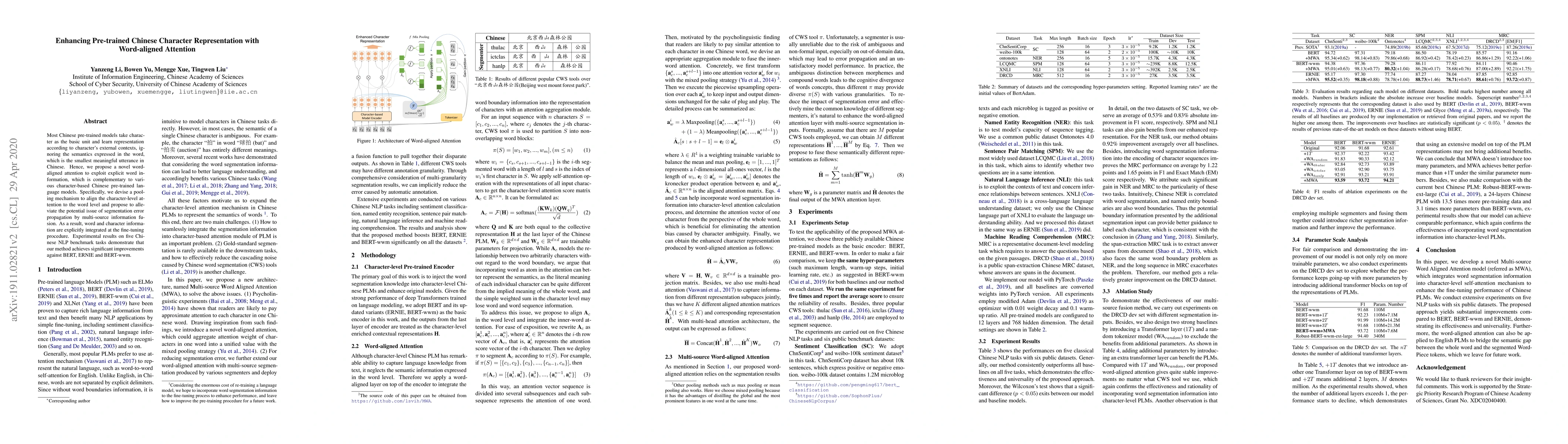 This paper proposes a novel word-aligned attention mechanism to enhance pre-trained Chinese character representation models by incorporating explicit word information, which complements traditional character-based approaches. Experimental results show significant improvements over several existing models on five Chinese NLP tasks.