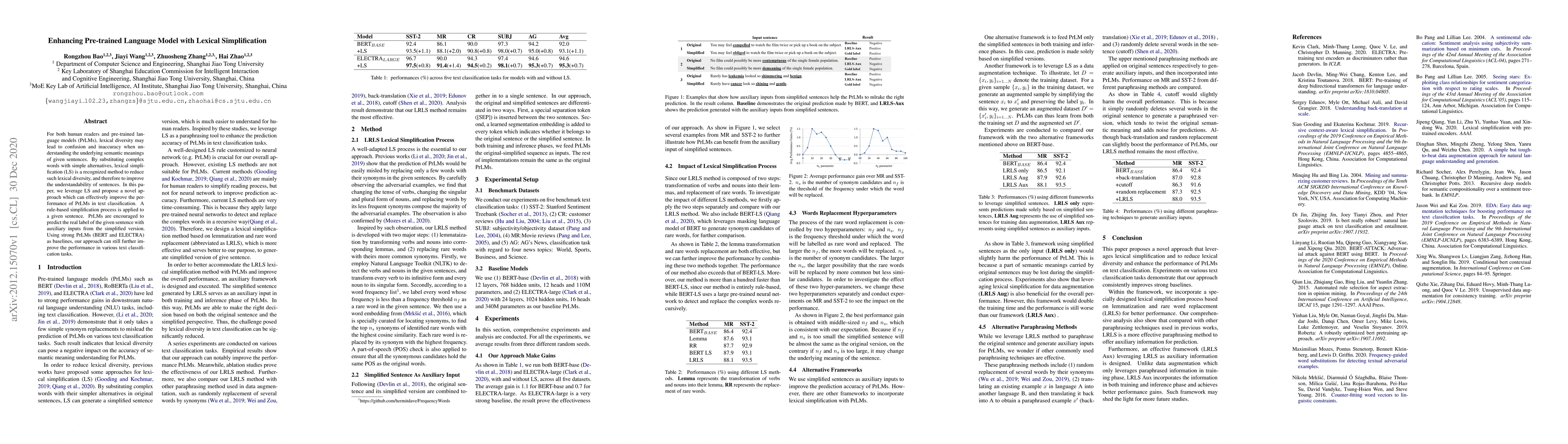 This paper proposes a method to enhance pre-trained language models (PrLMs) using lexical simplification (LS) to replace complex words with simpler alternatives, aiming to improve text classification performance. The approach uses a rule-based LS process and auxiliary inputs from simplified sentences, demonstrating improved performance over strong baselines like BERT and ELECTRA.