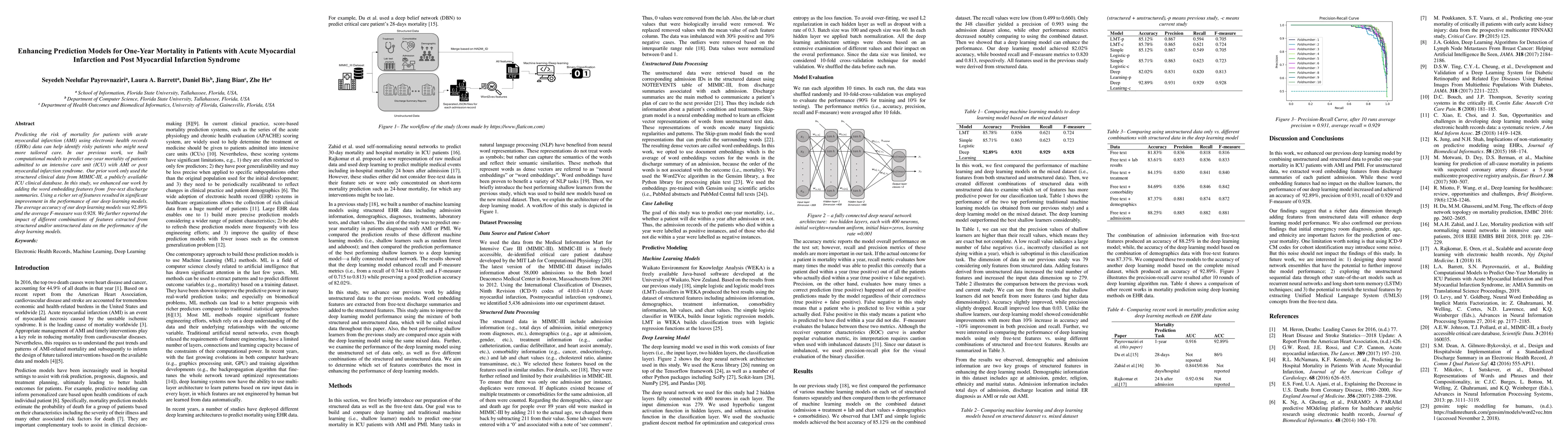 This study enhances prediction models for one-year mortality in AMI patients by incorporating word embedding features from free-text discharge summaries, achieving a 92.89% accuracy and 0.928 F-measure, significantly improving model performance compared to previous models using only structured data.