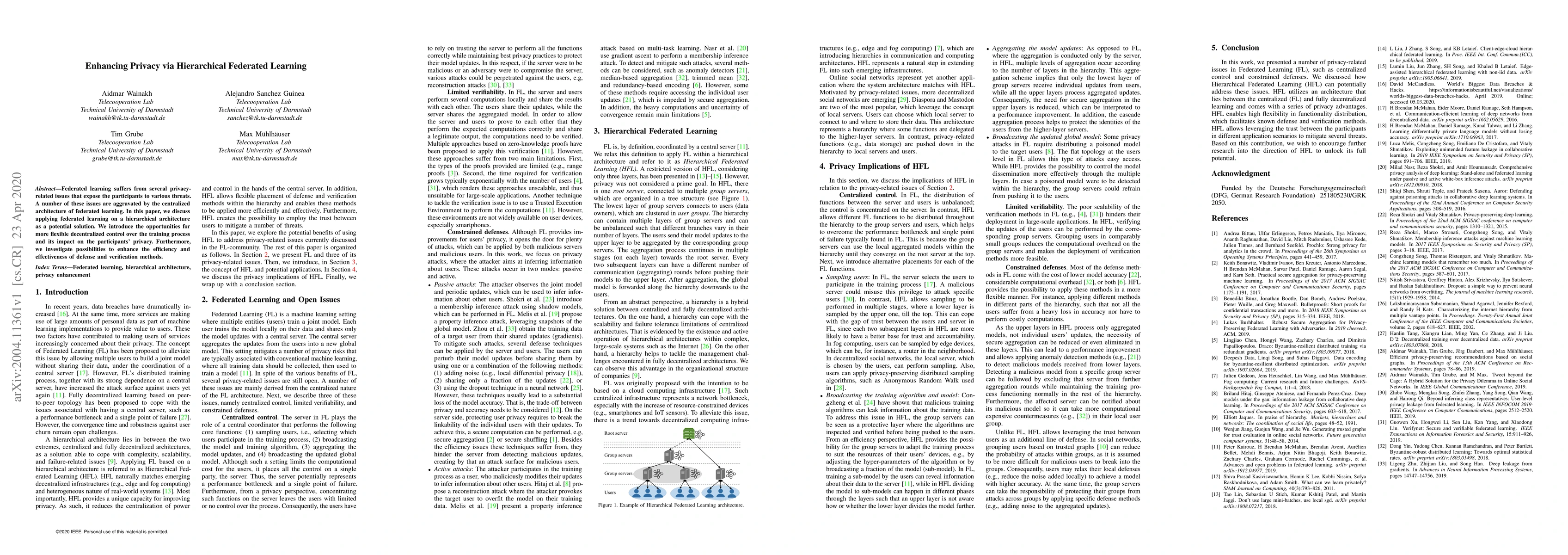 Federated learning suffers from several privacy-related issues that expose the participants to various threats. A number of these issues are aggravated by the centralized architecture of federated learning. In this paper, we discuss applying federated learning on a hierarchical architecture as a potential solution. We introduce the opportunities for more flexible decentralized control over the training process and its impact on the participants' privacy. Furthermore, we investigate possibilities to enhance the efficiency and effectiveness of defense and verification methods.