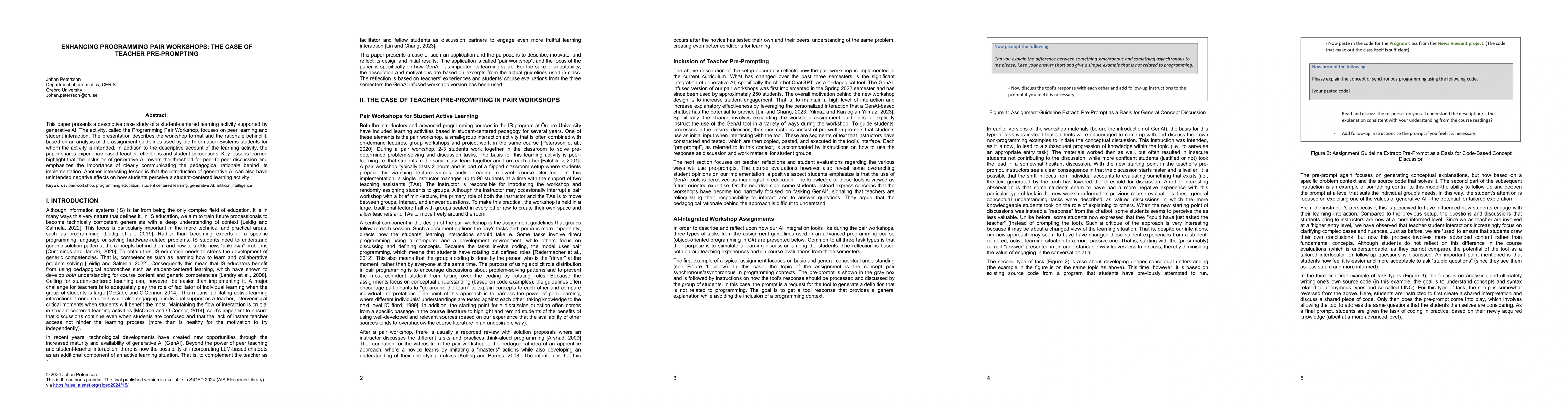 This paper explores the pedagogical potential of "teacher pre-prompting" as a means of guiding student collaboration in programming education. In particular, we investigate how brief teacher-initiated questions posed before students engage in pair programming workshops can help shape problem interpretation and division of labor. Based on qualitative analysis of video data from a university course in systems development, we identify five distinct pre-prompting patterns. Our findings suggest that such prompts can foster structured discussions, clarify task requirements, and create opportunities for shared learning experiences.