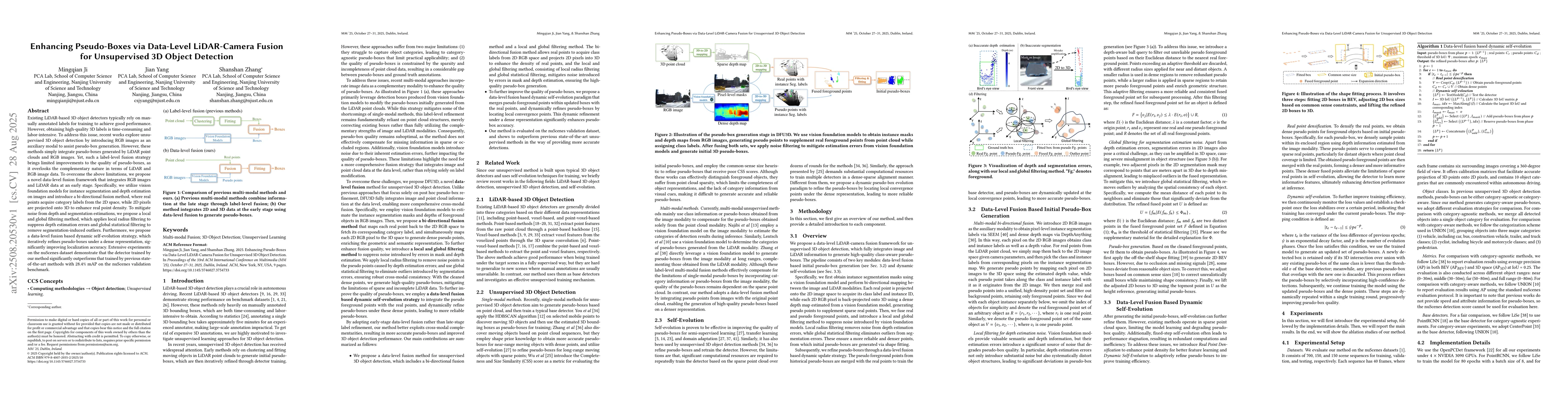 Existing LiDAR-based 3D object detectors typically rely on manually annotated labels for training to achieve good performance. However, obtaining high-quality 3D labels is time-consuming and labor-intensive. To address this issue, recent works explore unsupervised 3D object detection by introducing RGB images as an auxiliary modal to assist pseudo-box generation. However, these methods simply integrate pseudo-boxes generated by LiDAR point clouds and RGB images. Yet, such a label-level fusion strategy brings limited improvements to the quality of pseudo-boxes, as it overlooks the complementary nature in terms of LiDAR and RGB image data. To overcome the above limitations, we propose a novel data-level fusion framework that integrates RGB images and LiDAR data at an early stage. Specifically, we utilize vision foundation models for instance segmentation and depth estimation on images and introduce a bi-directional fusion method, where real points acquire category labels from the 2D space, while 2D pixels are projected onto 3D to enhance real point density. To mitigate noise from depth and segmentation estimations, we propose a local and global filtering method, which applies local radius filtering to suppress depth estimation errors and global statistical filtering to remove segmentation-induced outliers. Furthermore, we propose a data-level fusion based dynamic self-evolution strategy, which iteratively refines pseudo-boxes under a dense representation, significantly improving localization accuracy. Extensive experiments on the nuScenes dataset demonstrate that the detector trained by our method significantly outperforms that trained by previous state-of-the-art methods with 28.4$\%$ mAP on the nuScenes validation benchmark.