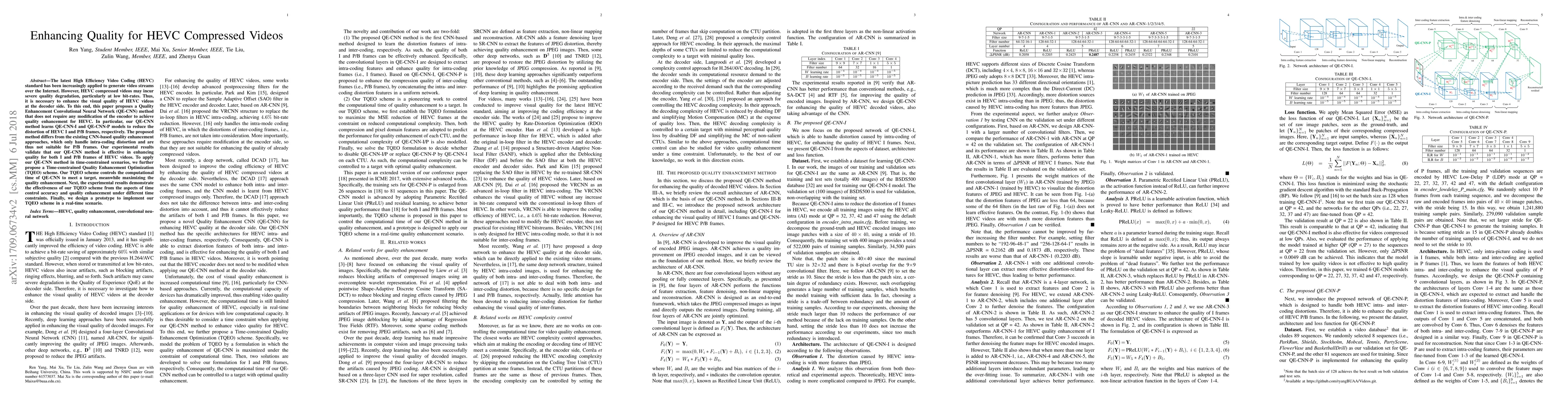 This paper proposes a Quality Enhancement Convolutional Neural Network (QE-CNN) to improve the visual quality of HEVC compressed videos without altering the encoder. The QE-CNN method includes QE-CNN-I and QE-CNN-P models for I and P frames, respectively, and introduces a Time-constrained Quality Enhancement Optimization (TQEO) scheme to balance computational time and quality enhancement in real-time scenarios. Experimental results show the effectiveness of both QE-CNN and TQEO in enhancing video quality under various time constraints.