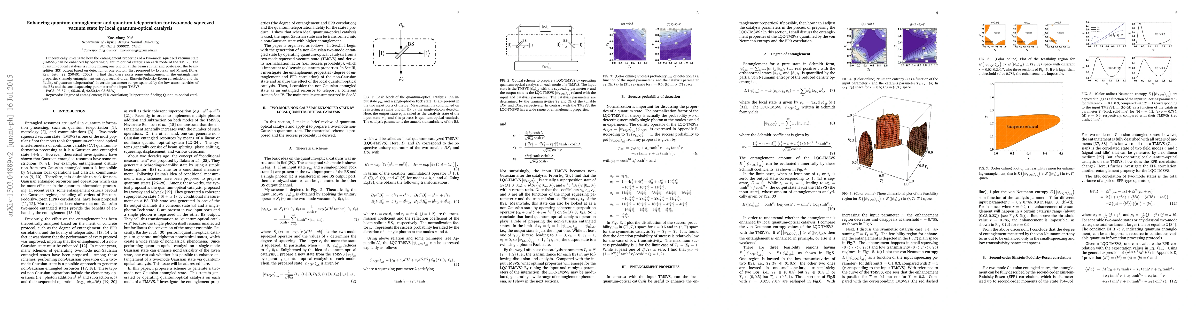 This paper explores the enhancement of entanglement properties in a two-mode squeezed vacuum state through local quantum-optical catalysis, finding improvements in entanglement entropy, correlation, and teleportation fidelity under specific conditions involving low beam splitter transmissivities and small input squeezing.
