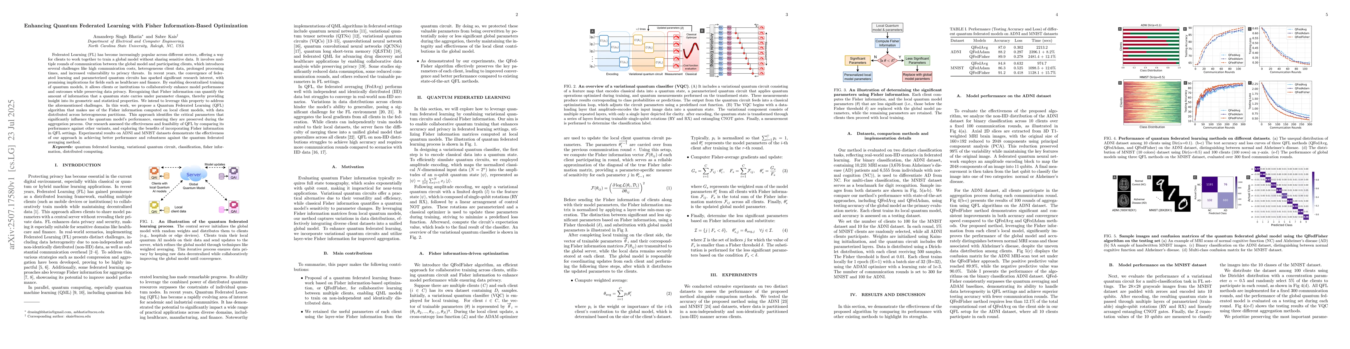 Federated Learning (FL) has become increasingly popular across different sectors, offering a way for clients to work together to train a global model without sharing sensitive data. It involves multiple rounds of communication between the global model and participating clients, which introduces several challenges like high communication costs, heterogeneous client data, prolonged processing times, and increased vulnerability to privacy threats. In recent years, the convergence of federated learning and parameterized quantum circuits has sparked significant research interest, with promising implications for fields such as healthcare and finance. By enabling decentralized training of quantum models, it allows clients or institutions to collaboratively enhance model performance and outcomes while preserving data privacy. Recognizing that Fisher information can quantify the amount of information that a quantum state carries under parameter changes, thereby providing insight into its geometric and statistical properties. We intend to leverage this property to address the aforementioned challenges. In this work, we propose a Quantum Federated Learning (QFL) algorithm that makes use of the Fisher information computed on local client models, with data distributed across heterogeneous partitions. This approach identifies the critical parameters that significantly influence the quantum model's performance, ensuring they are preserved during the aggregation process. Our research assessed the effectiveness and feasibility of QFL by comparing its performance against other variants, and exploring the benefits of incorporating Fisher information in QFL settings. Experimental results on ADNI and MNIST datasets demonstrate the effectiveness of our approach in achieving better performance and robustness against the quantum federated averaging method.