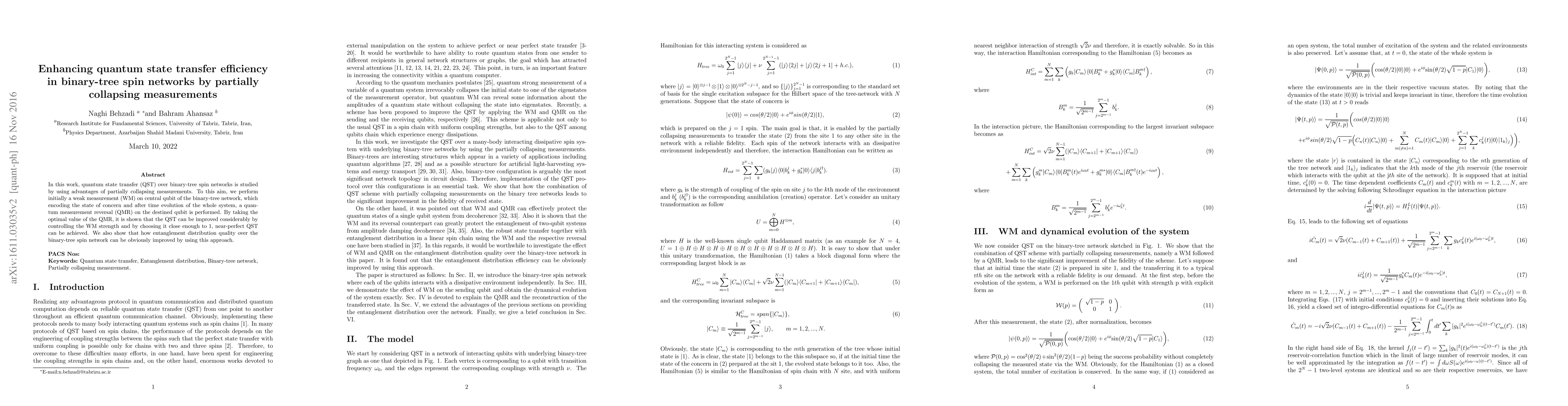 In this work, quantum state transfer (QST) over binary-tree spin networks is studied by using advantages of partially collapsing measurements. To this aim, we perform initially a weak measurement (WM) on central qubit of the binary-tree network, which encoding the state of concern and after time evolution of the whole system, a quantum measurement reversal (QMR) on the destined qubit is performed. By taking the optimal value of the QMR, it is shown that the QST can be improved considerably by controlling the WM strength and by choosing it close enough to 1, near-perfect QST can be achieved. We also show that how entanglement distribution quality over the binary-tree spin network can be obviously improved by using this approach.