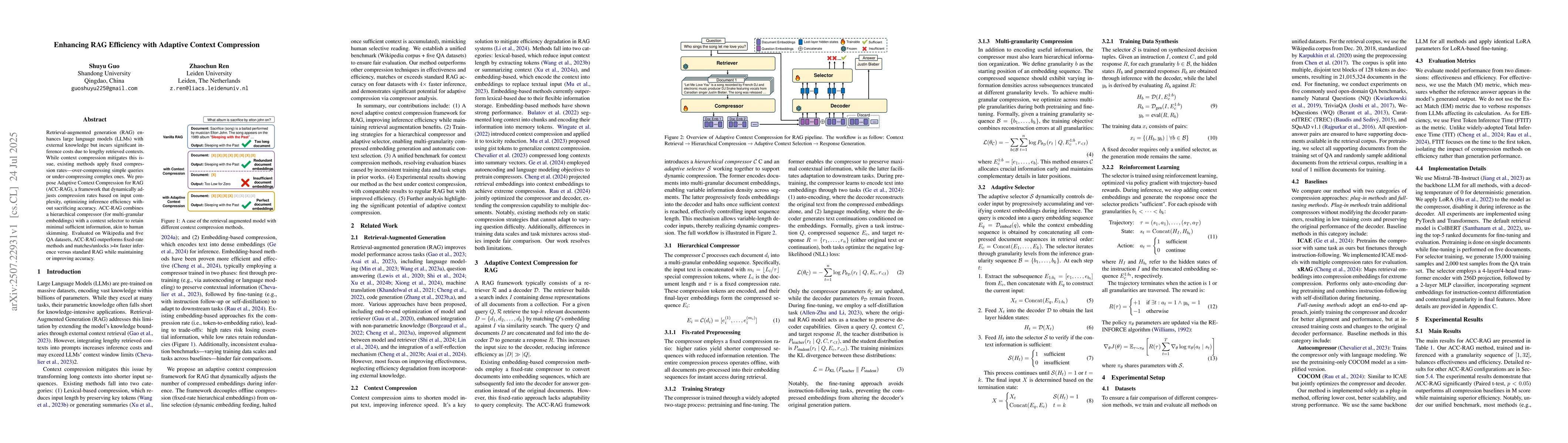 Retrieval-augmented generation (RAG) enhances large language models (LLMs) with external knowledge but incurs significant inference costs due to lengthy retrieved contexts. While context compression mitigates this issue, existing methods apply fixed compression rates, over-compressing simple queries or under-compressing complex ones. We propose Adaptive Context Compression for RAG (ACC-RAG), a framework that dynamically adjusts compression rates based on input complexity, optimizing inference efficiency without sacrificing accuracy. ACC-RAG combines a hierarchical compressor (for multi-granular embeddings) with a context selector to retain minimal sufficient information, akin to human skimming. Evaluated on Wikipedia and five QA datasets, ACC-RAG outperforms fixed-rate methods and matches/unlocks over 4 times faster inference versus standard RAG while maintaining or improving accuracy.