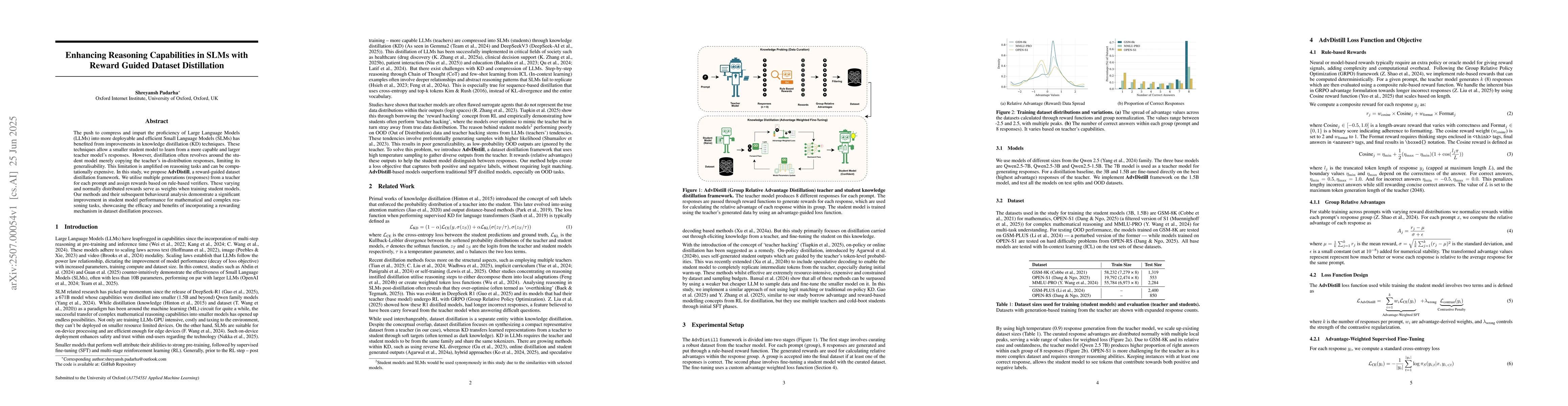 The push to compress and impart the proficiency of Large Language Models (LLMs) into more deployable and efficient Small Language Models (SLMs) has benefited from improvements in knowledge distillation (KD) techniques. These techniques allow a smaller student model to learn from a more capable and larger teacher model's responses. However, distillation often revolves around the student model merely copying the teacher's in-distribution responses, limiting its generalisability. This limitation is amplified on reasoning tasks and can be computationally expensive. In this study, we propose AdvDistill, a reward-guided dataset distillation framework. We utilise multiple generations (responses) from a teacher for each prompt and assign rewards based on rule-based verifiers. These varying and normally distributed rewards serve as weights when training student models. Our methods and their subsequent behavioural analysis demonstrate a significant improvement in student model performance for mathematical and complex reasoning tasks, showcasing the efficacy and benefits of incorporating a rewarding mechanism in dataset distillation processes.