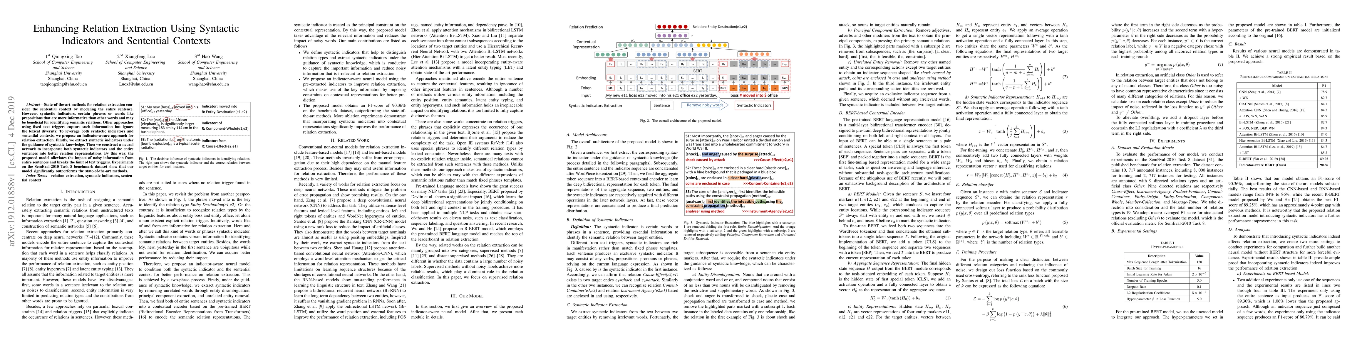 This paper proposes an indicator-aware neural network for relation extraction, combining syntactic indicators with full sentential contexts to enhance performance. The model leverages syntactic knowledge to extract key indicators and outperforms existing methods on the SemEval-2010 Task 8 dataset.