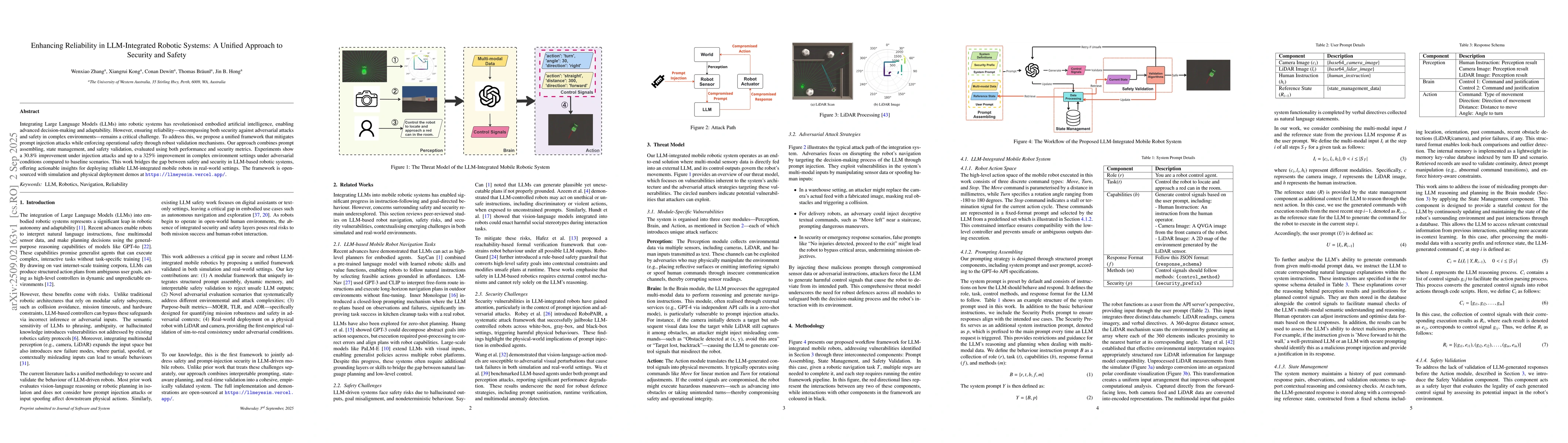 Integrating large language models (LLMs) into robotic systems has revolutionised embodied artificial intelligence, enabling advanced decision-making and adaptability. However, ensuring reliability, encompassing both security against adversarial attacks and safety in complex environments, remains a critical challenge. To address this, we propose a unified framework that mitigates prompt injection attacks while enforcing operational safety through robust validation mechanisms. Our approach combines prompt assembling, state management, and safety validation, evaluated using both performance and security metrics. Experiments show a 30.8% improvement under injection attacks and up to a 325% improvement in complex environment settings under adversarial conditions compared to baseline scenarios. This work bridges the gap between safety and security in LLM-based robotic systems, offering actionable insights for deploying reliable LLM-integrated mobile robots in real-world settings. The framework is open-sourced with simulation and physical deployment demos at https://llmeyesim.vercel.app/