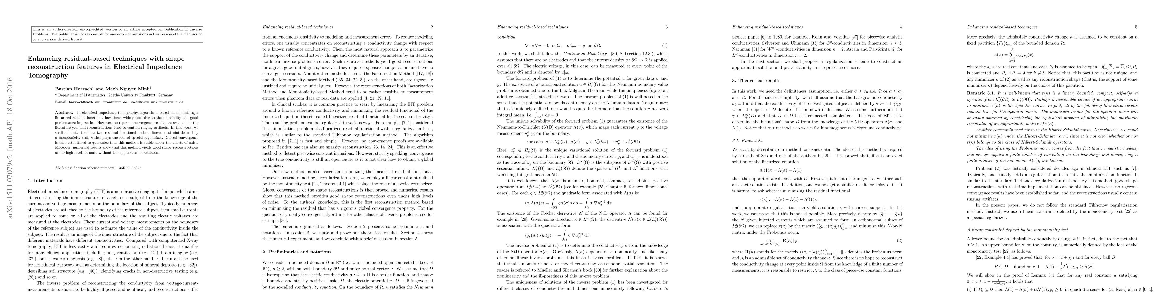 This paper proposes a new method for electrical impedance tomography that enhances residual-based techniques by incorporating shape reconstruction features through a monotonicity test as a regularizer. The method ensures global convergence and produces accurate shape reconstructions even under high noise levels, without introducing artifacts.