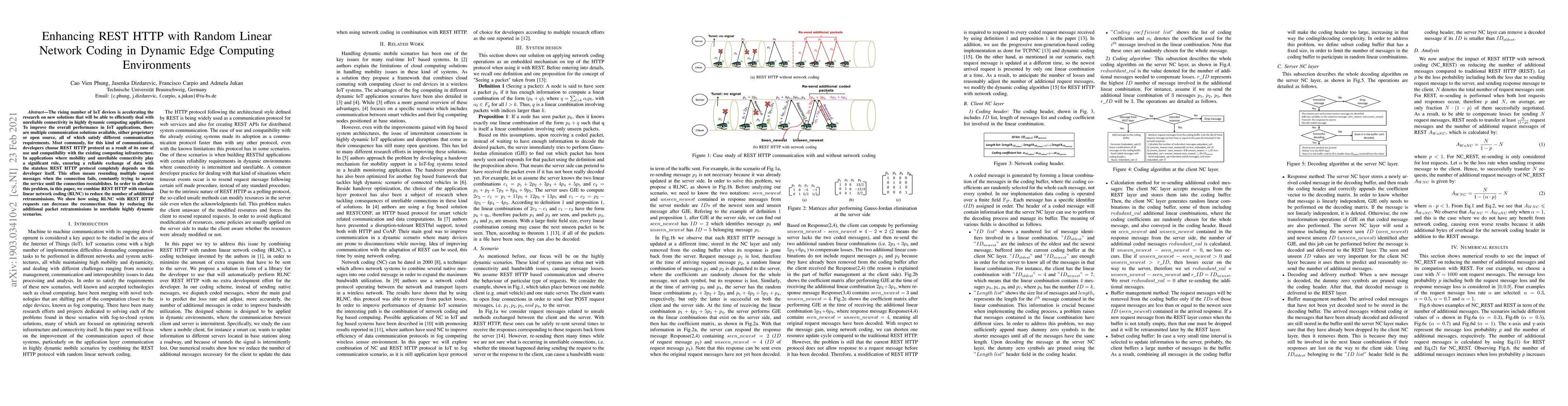 This paper improves REST HTTP with random linear network coding to reduce retransmissions in IoT applications with unreliable connectivity, decreasing reconnection time.
