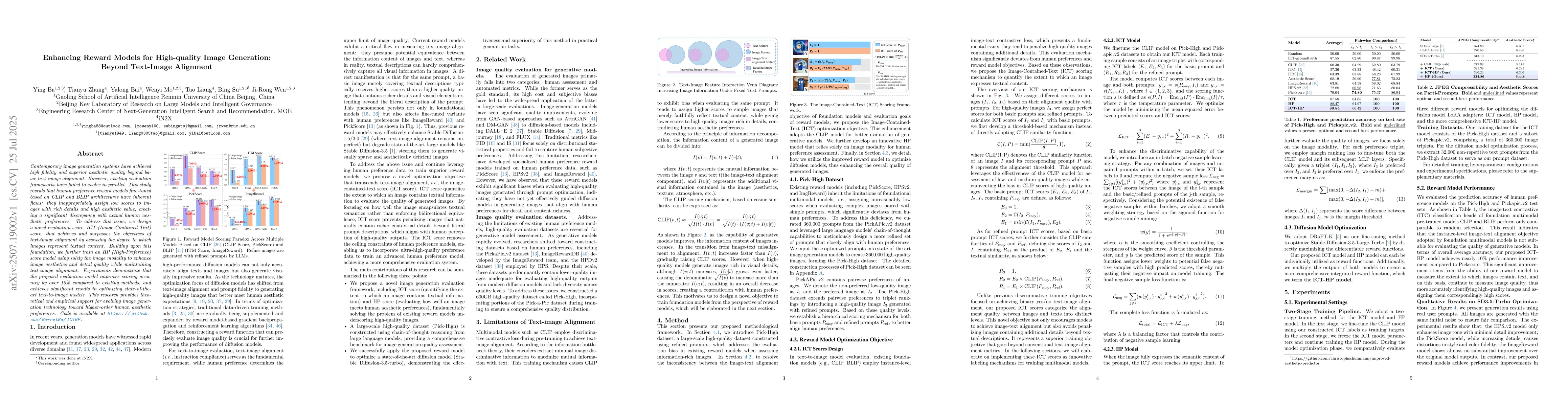 Contemporary image generation systems have achieved high fidelity and superior aesthetic quality beyond basic text-image alignment. However, existing evaluation frameworks have failed to evolve in parallel. This study reveals that human preference reward models fine-tuned based on CLIP and BLIP architectures have inherent flaws: they inappropriately assign low scores to images with rich details and high aesthetic value, creating a significant discrepancy with actual human aesthetic preferences. To address this issue, we design a novel evaluation score, ICT (Image-Contained-Text) score, that achieves and surpasses the objectives of text-image alignment by assessing the degree to which images represent textual content. Building upon this foundation, we further train an HP (High-Preference) score model using solely the image modality to enhance image aesthetics and detail quality while maintaining text-image alignment. Experiments demonstrate that the proposed evaluation model improves scoring accuracy by over 10\% compared to existing methods, and achieves significant results in optimizing state-of-the-art text-to-image models. This research provides theoretical and empirical support for evolving image generation technology toward higher-order human aesthetic preferences. Code is available at https://github.com/BarretBa/ICTHP.