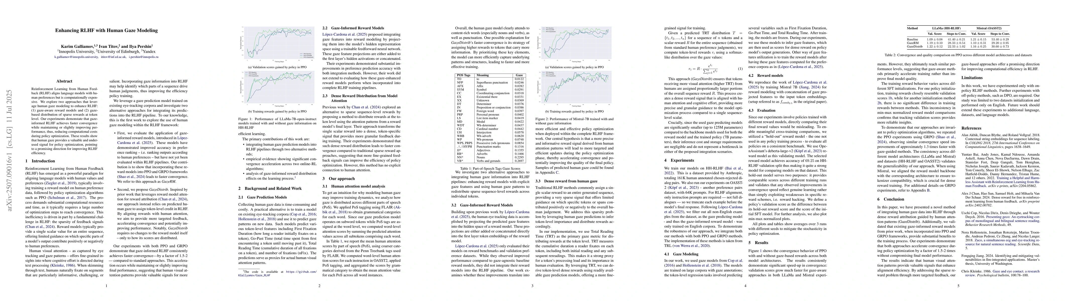 Reinforcement Learning from Human Feedback (RLHF) aligns language models with human preferences but is computationally expensive. We explore two approaches that leverage human gaze modeling to enhance RLHF: (1) gaze-aware reward models and (2) gaze-based distribution of sparse rewards at token level. Our experiments demonstate that gaze-informed RLHF achieves faster convergence while maintaining or slightly improving performance, thus, reducing computational costs during policy optimization. These results show that human gaze provides a valuable and underused signal for policy optimization, pointing to a promising direction for improving RLHF efficiency.