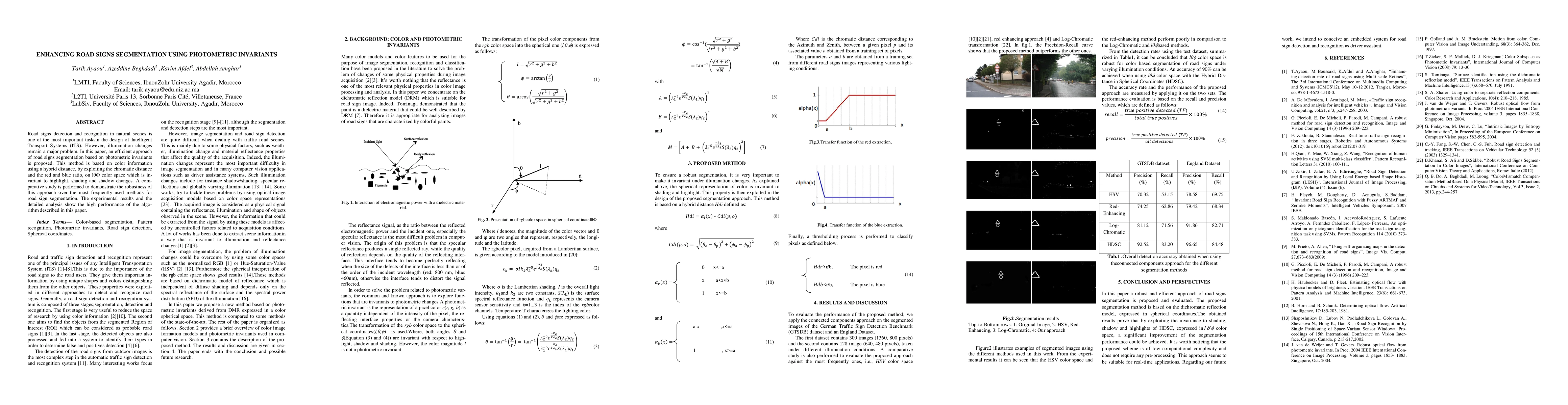 This paper proposes a road signs segmentation method using photometric invariants to enhance detection under changing illumination conditions, demonstrating high performance over existing methods.
