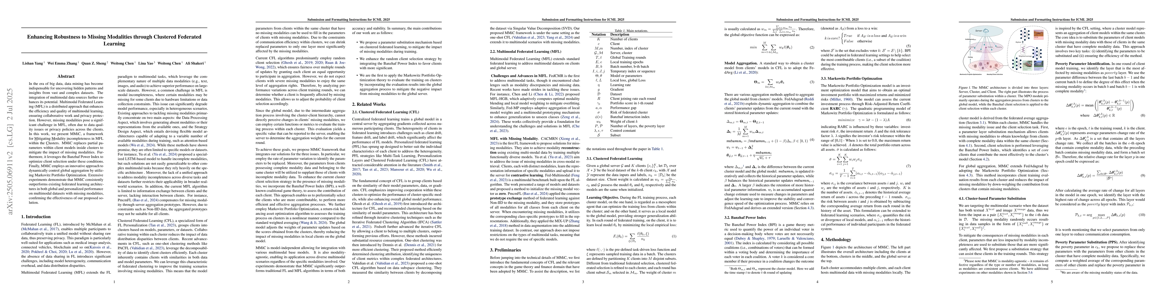 In the era of big data, data mining has become indispensable for uncovering hidden patterns and insights from vast and complex datasets. The integration of multimodal data sources further enhances its potential. Multimodal Federated Learning (MFL) is a distributed approach that enhances the efficiency and quality of multimodal learning, ensuring collaborative work and privacy protection. However, missing modalities pose a significant challenge in MFL, often due to data quality issues or privacy policies across the clients. In this work, we present MMiC, a framework for Mitigating Modality incompleteness in MFL within the Clusters. MMiC replaces partial parameters within client models inside clusters to mitigate the impact of missing modalities. Furthermore, it leverages the Banzhaf Power Index to optimize client selection under these conditions. Finally, MMiC employs an innovative approach to dynamically control global aggregation by utilizing Markovitz Portfolio Optimization. Extensive experiments demonstrate that MMiC consistently outperforms existing federated learning architectures in both global and personalized performance on multimodal datasets with missing modalities, confirming the effectiveness of our proposed solution.