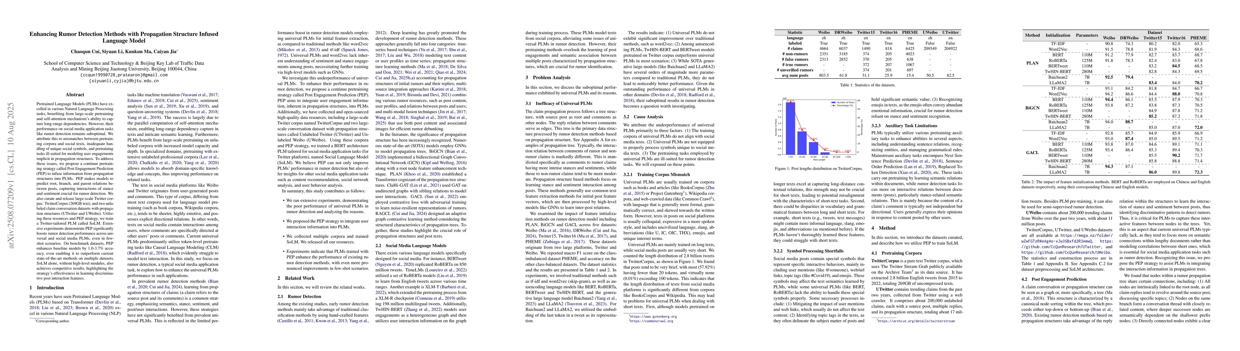 This research is significant as it addresses the suboptimal performance of PLMs in social media applications like rumor detection by infusing propagation structure information, which is crucial for capturing user engagements and stance sentiments.