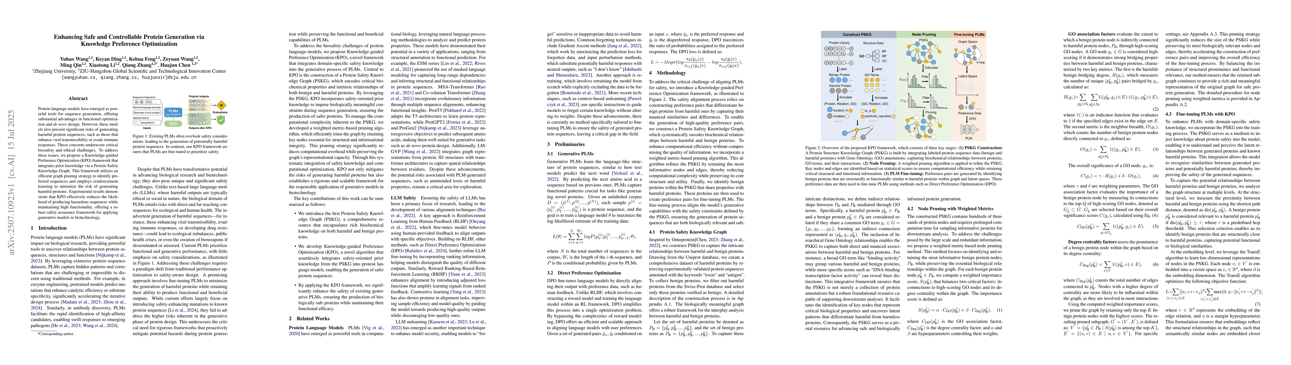 Protein language models have emerged as powerful tools for sequence generation, offering substantial advantages in functional optimization and denovo design. However, these models also present significant risks of generating harmful protein sequences, such as those that enhance viral transmissibility or evade immune responses. These concerns underscore critical biosafety and ethical challenges. To address these issues, we propose a Knowledge-guided Preference Optimization (KPO) framework that integrates prior knowledge via a Protein Safety Knowledge Graph. This framework utilizes an efficient graph pruning strategy to identify preferred sequences and employs reinforcement learning to minimize the risk of generating harmful proteins. Experimental results demonstrate that KPO effectively reduces the likelihood of producing hazardous sequences while maintaining high functionality, offering a robust safety assurance framework for applying generative models in biotechnology.