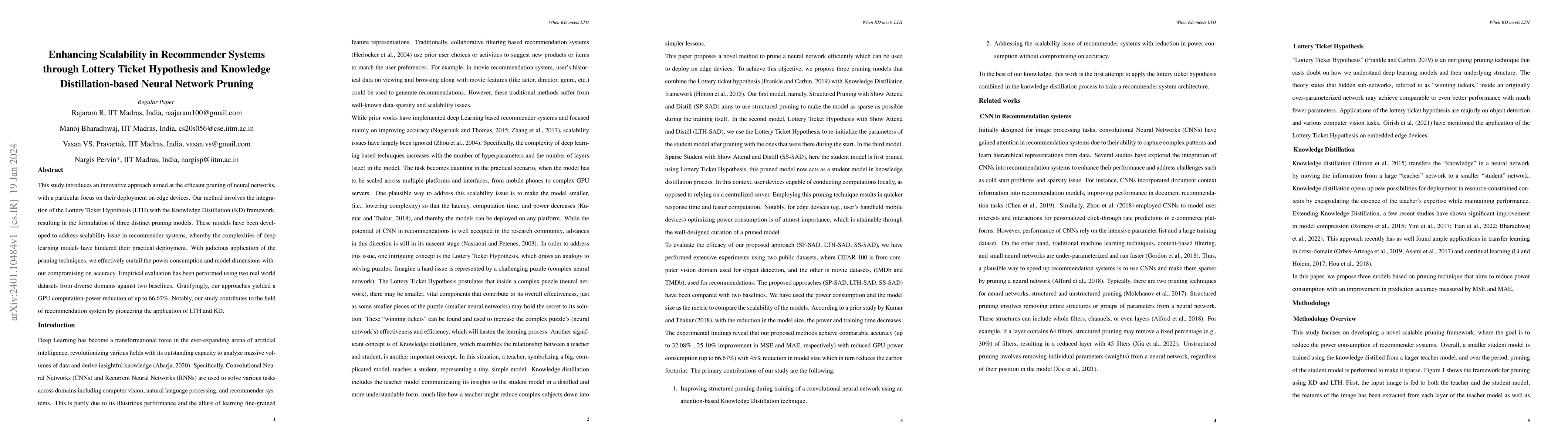 This study introduces an innovative approach aimed at the efficient pruning of neural networks, with a particular focus on their deployment on edge devices. Our method involves the integration of the Lottery Ticket Hypothesis (LTH) with the Knowledge Distillation (KD) framework, resulting in the formulation of three distinct pruning models. These models have been developed to address scalability issue in recommender systems, whereby the complexities of deep learning models have hindered their practical deployment. With judicious application of the pruning techniques, we effectively curtail the power consumption and model dimensions without compromising on accuracy. Empirical evaluation has been performed using two real world datasets from diverse domains against two baselines. Gratifyingly, our approaches yielded a GPU computation-power reduction of up to 66.67%. Notably, our study contributes to the field of recommendation system by pioneering the application of LTH and KD.