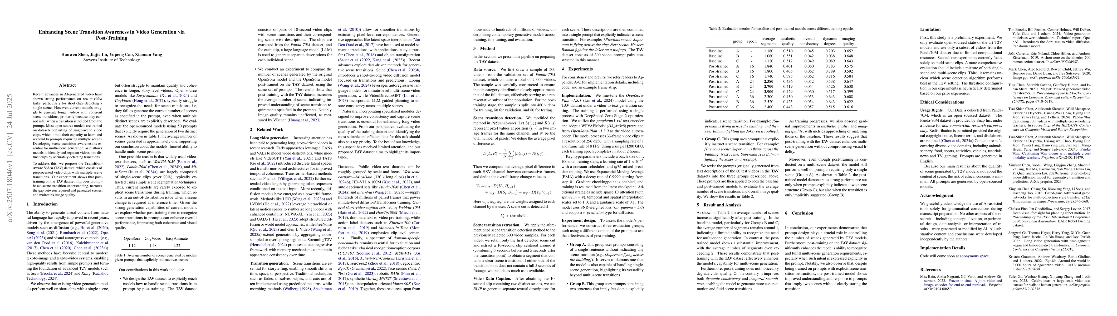Recent advances in AI-generated video have shown strong performance on \emph{text-to-video} tasks, particularly for short clips depicting a single scene. However, current models struggle to generate longer videos with coherent scene transitions, primarily because they cannot infer when a transition is needed from the prompt. Most open-source models are trained on datasets consisting of single-scene video clips, which limits their capacity to learn and respond to prompts requiring multiple scenes. Developing scene transition awareness is essential for multi-scene generation, as it allows models to identify and segment videos into distinct clips by accurately detecting transitions. To address this, we propose the \textbf{Transition-Aware Video} (TAV) dataset, which consists of preprocessed video clips with multiple scene transitions. Our experiment shows that post-training on the \textbf{TAV} dataset improves prompt-based scene transition understanding, narrows the gap between required and generated scenes, and maintains image quality.