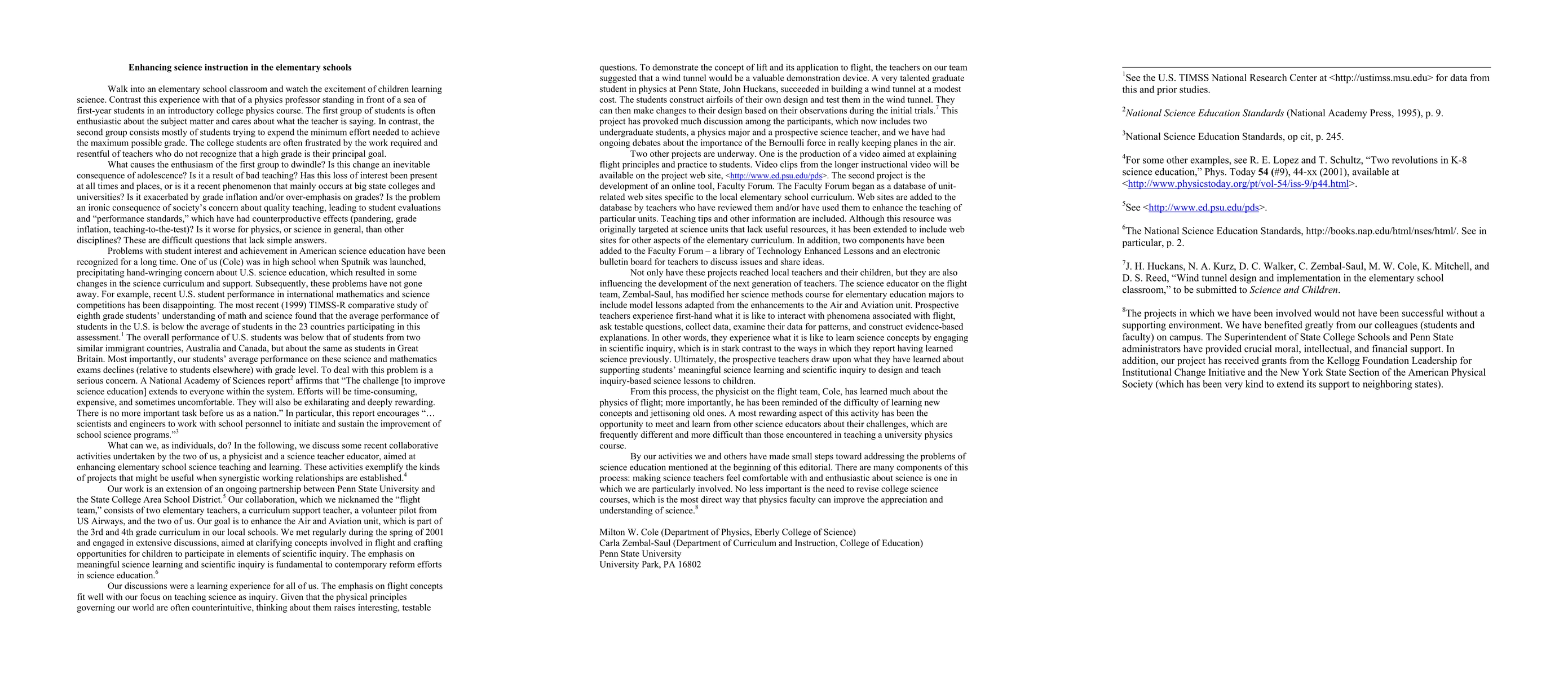 This article describes some collaborative activities of the authors, aimed at improving science education in elementary schools. These include curriculum enhancement, development of new apparatus (a wind tunnel), science-education web site contributions and production of a film about the physics of flight. The output of these projects is intended to be generally accessible or reproducible.