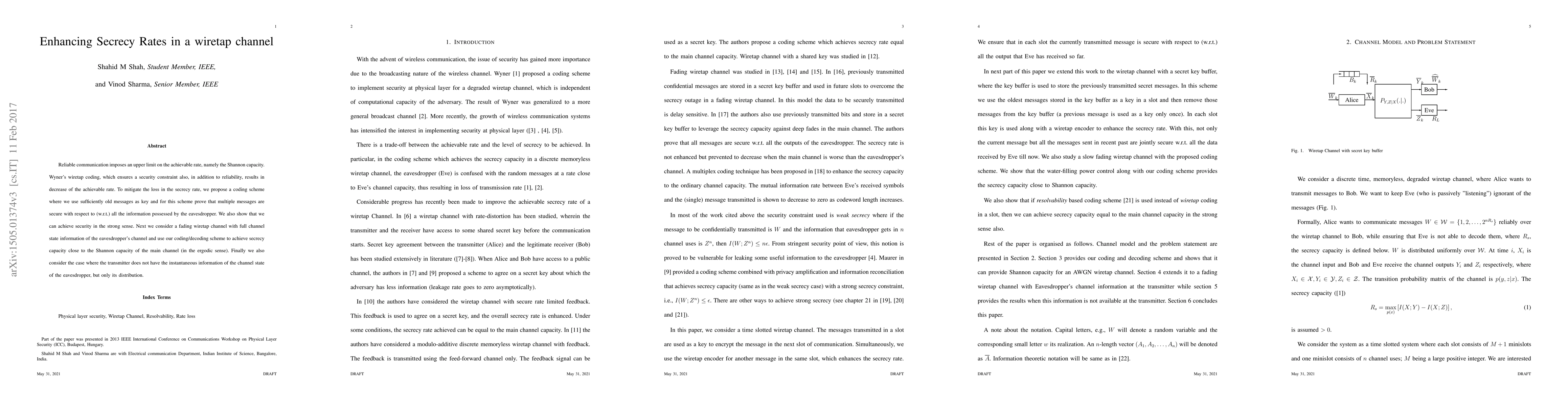 Reliable communication imposes an upper limit on the achievable rate, namely the Shannon capacity. Wyner's wiretap coding, which ensures a security constraint also, in addition to reliability, results in decrease of the achievable rate. To mitigate the loss in the secrecy rate, we propose a coding scheme where we use sufficiently old messages as key and for this scheme prove that multiple messages are secure with respect to (w.r.t.) all the information possessed by the eavesdropper. We also show that we can achieve security in the strong sense. Next we consider a fading wiretap channel with full channel state information of the eavesdropper's channel and use our coding/decoding scheme to achieve secrecy capacity close to the Shannon capacity of the main channel (in the ergodic sense). Finally we also consider the case where the transmitter does not have the instantaneous information of the channel state of the eavesdropper, but only its distribution.