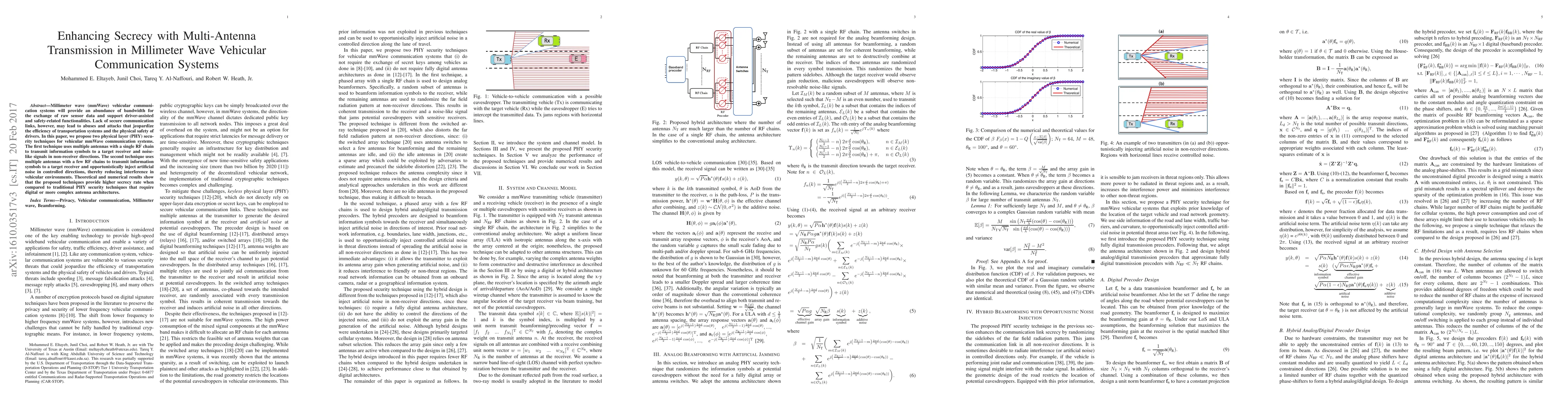This paper proposes two physical layer security techniques for millimeter wave vehicular communication systems to enhance secrecy. The techniques involve multi-antenna transmission with single or few RF chains to transmit signals to target receivers while reducing interference and noise in non-receiver directions, achieving higher secrecy rates compared to traditional methods.