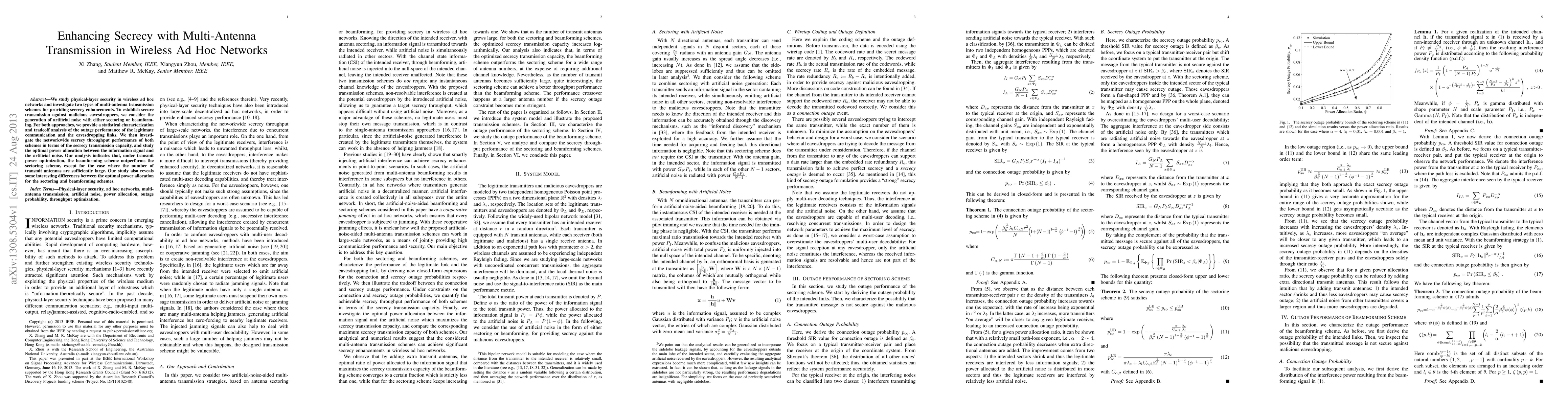 We study physical-layer security in wireless ad hoc networks and investigate two types of multi-antenna transmission schemes for providing secrecy enhancements. To establish secure transmission against malicious eavesdroppers, we consider the generation of artificial noise with either sectoring or beamforming. For both approaches, we provide a statistical characterization and tradeoff analysis of the outage performance of the legitimate communication and the eavesdropping links. We then investigate the networkwide secrecy throughput performance of both schemes in terms of the secrecy transmission capacity, and study the optimal power allocation between the information signal and the artificial noise. Our analysis indicates that, under transmit power optimization, the beamforming scheme outperforms the sectoring scheme, except for the case where the number of transmit antennas are sufficiently large. Our study also reveals some interesting differences between the optimal power allocation for the sectoring and beamforming schemes.