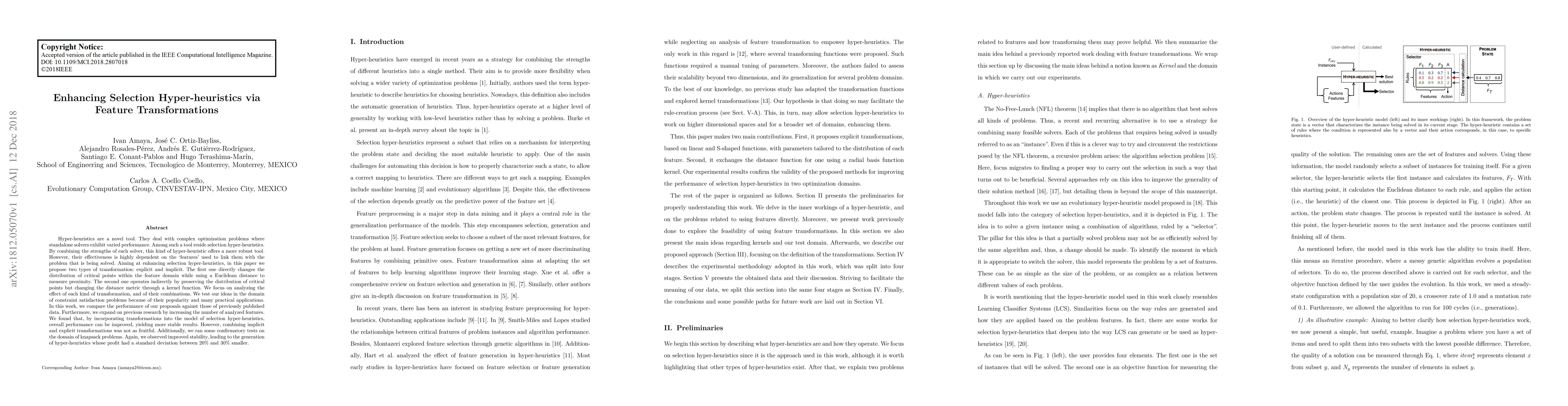 This paper proposes two feature transformation types—explicit and implicit—to enhance selection hyper-heuristics in solving complex optimization problems. Tests on constraint satisfaction and knapsack problems show improved performance and stability when transformations are applied, though combining both types did not yield additional benefits.