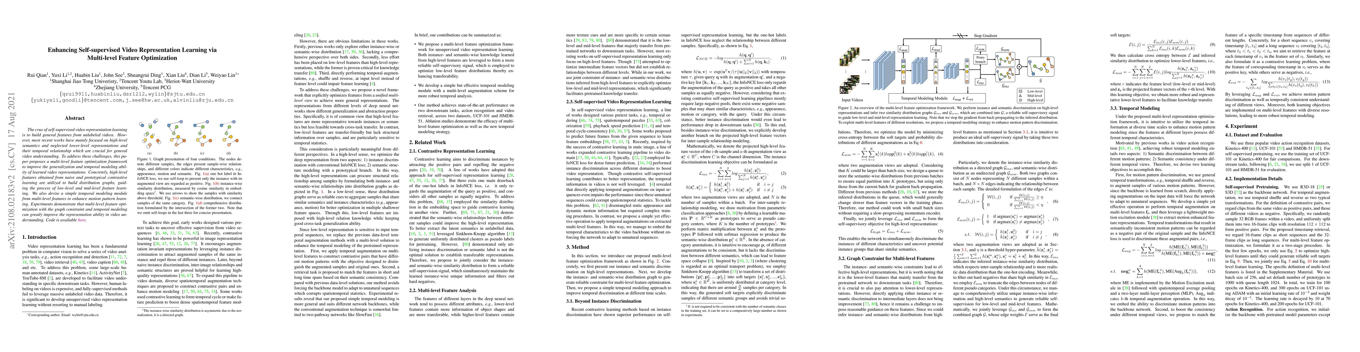 This paper proposes a multi-level feature optimization framework to enhance self-supervised video representation learning by integrating both high-level and lower-level features, improving generalization and temporal modeling. The approach utilizes contrastive learning and a temporal modeling module to boost video understanding capabilities.