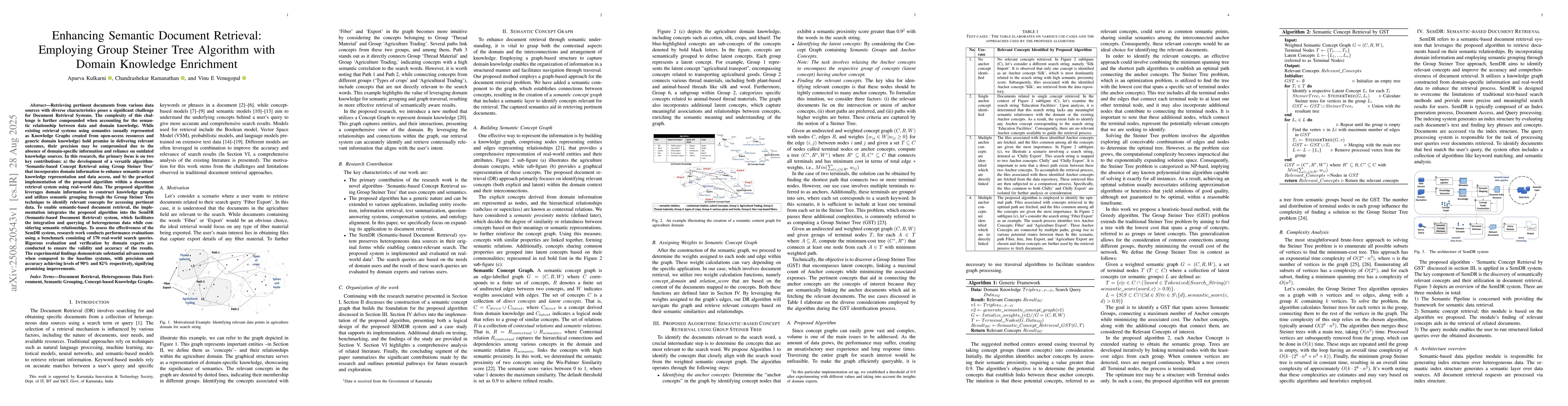 Retrieving pertinent documents from various data sources with diverse characteristics poses a significant challenge for Document Retrieval Systems. The complexity of this challenge is further compounded when accounting for the semantic relationship between data and domain knowledge. While existing retrieval systems using semantics (usually represented as Knowledge Graphs created from open-access resources and generic domain knowledge) hold promise in delivering relevant outcomes, their precision may be compromised due to the absence of domain-specific information and reliance on outdated knowledge sources. In this research, the primary focus is on two key contributions- a) the development of a versatile algorithm- 'Semantic-based Concept Retrieval using Group Steiner Tree' that incorporates domain information to enhance semantic-aware knowledge representation and data access, and b) the practical implementation of the proposed algorithm within a document retrieval system using real-world data. To assess the effectiveness of the SemDR system, research work conducts performance evaluations using a benchmark consisting of 170 real-world search queries. Rigorous evaluation and verification by domain experts are conducted to ensure the validity and accuracy of the results. The experimental findings demonstrate substantial advancements when compared to the baseline systems, with precision and accuracy achieving levels of 90% and 82% respectively, signifying promising improvements.