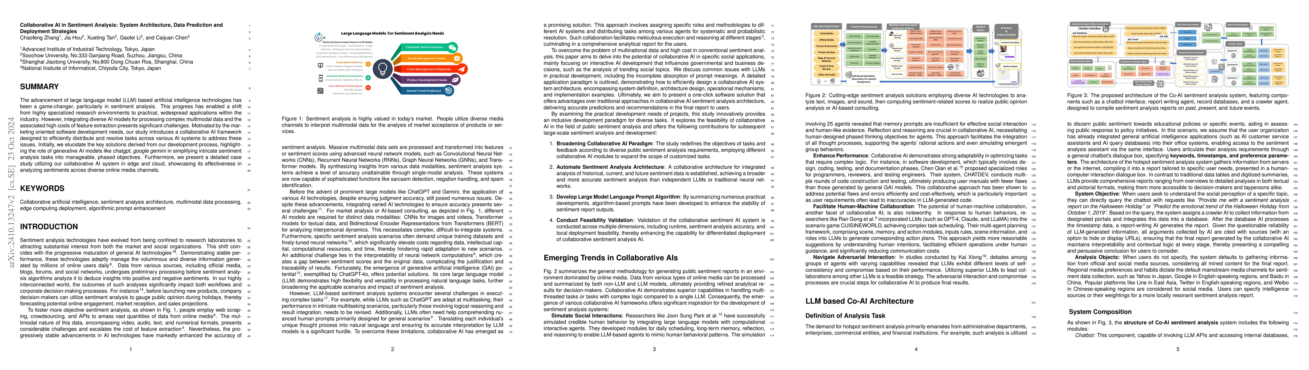 The advancement of large language model (LLM) based artificial intelligence technologies has been a game-changer, particularly in sentiment analysis. This progress has enabled a shift from highly specialized research environments to practical, widespread applications within the industry. However, integrating diverse AI models for processing complex multimodal data and the associated high costs of feature extraction presents significant challenges. Motivated by the marketing oriented software development +needs, our study introduces a collaborative AI framework designed to efficiently distribute and resolve tasks across various AI systems to address these issues. Initially, we elucidate the key solutions derived from our development process, highlighting the role of generative AI models like \emph{chatgpt}, \emph{google gemini} in simplifying intricate sentiment analysis tasks into manageable, phased objectives. Furthermore, we present a detailed case study utilizing our collaborative AI system in edge and cloud, showcasing its effectiveness in analyzing sentiments across diverse online media channels.