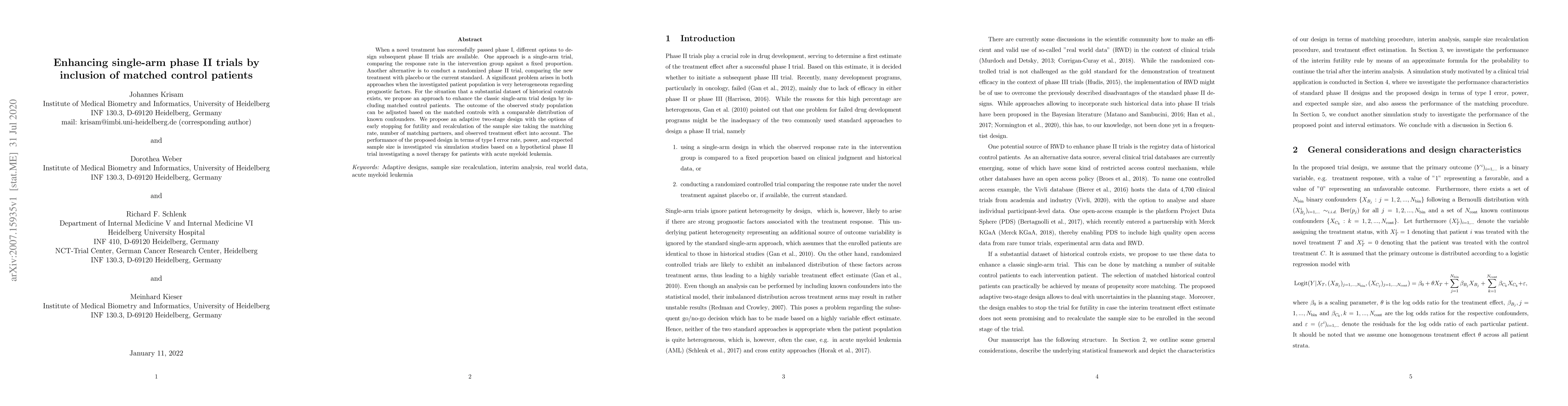 This paper proposes an enhanced single-arm phase II trial design that includes matched control patients to improve outcomes in heterogeneous patient populations. The suggested adaptive two-stage design allows for early stopping and sample size recalculation based on matching and treatment effect, evaluated through simulation studies for a novel therapy in acute myeloid leukemia.