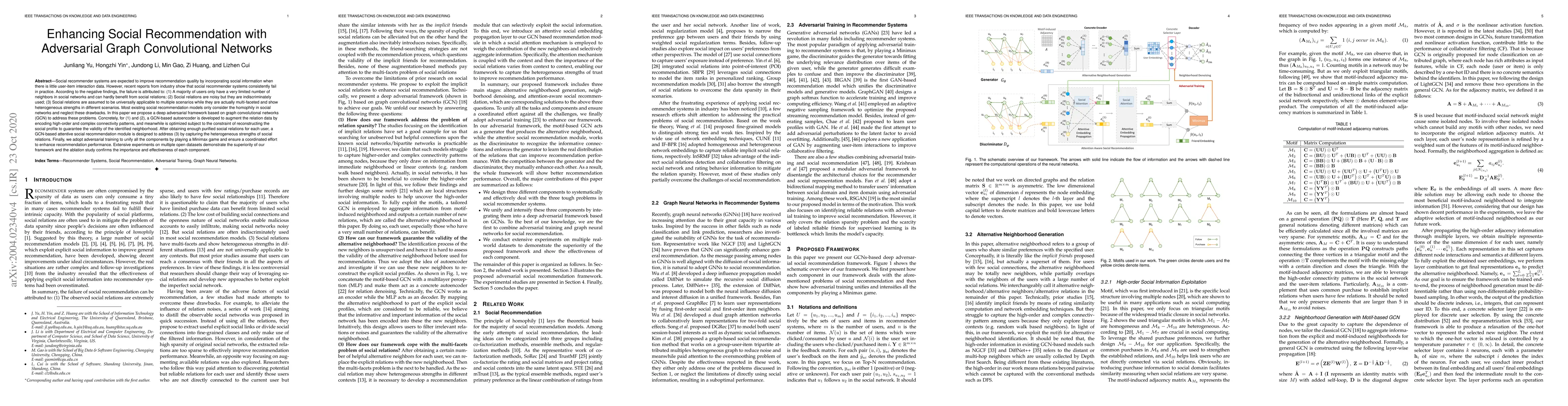 This paper proposes a deep adversarial framework using graph convolutional networks (GCN) to enhance social recommendation by addressing issues of limited social network data, noisy relations, and heterogeneous social strengths. The framework integrates a GCN-based autoencoder to purify social relations and an attentive recommendation module to capture their varying strengths, ultimately improving recommendation quality.