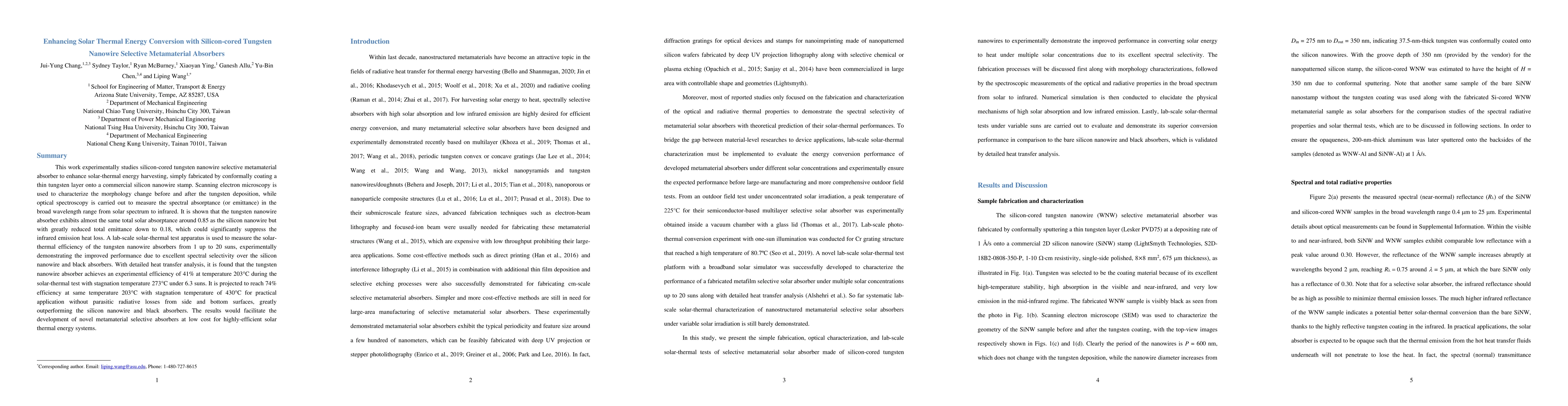 This paper investigates the use of silicon-cored tungsten nanowire metamaterial absorbers to enhance solar thermal energy conversion, achieving high solar absorptance and low emittance, and demonstrating an experimental efficiency of 41% at 203°C, with projections for up to 74% efficiency for practical applications.