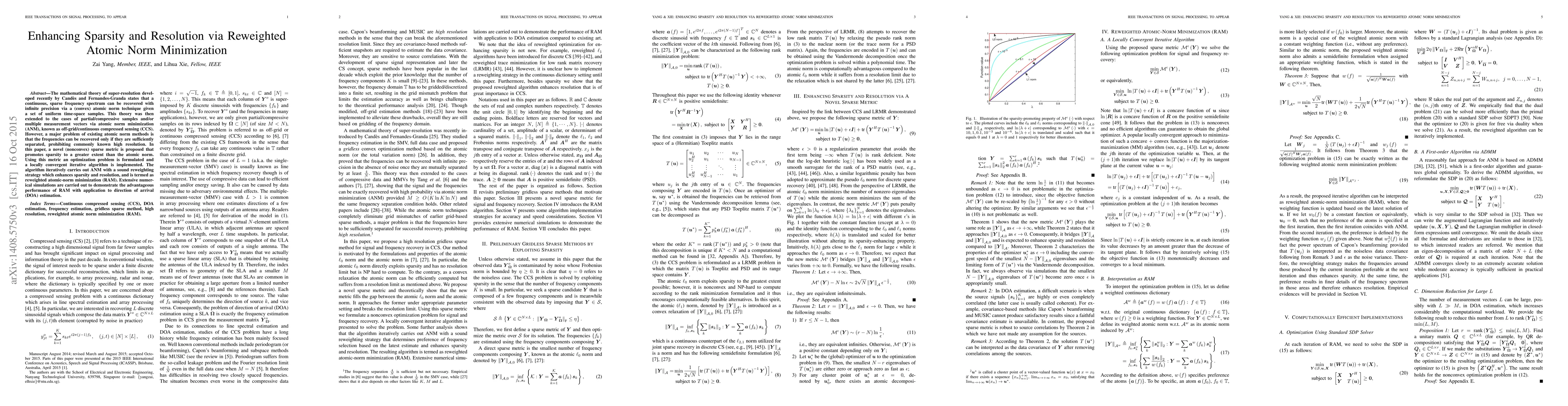 This paper proposes a novel reweighted atomic-norm minimization (RAM) method to enhance sparsity and resolution in super-resolution problems, addressing limitations of existing atomic norm techniques. The RAM algorithm iteratively applies atomic norm minimization with a reweighting strategy, demonstrating improved performance in direction of arrival estimation.