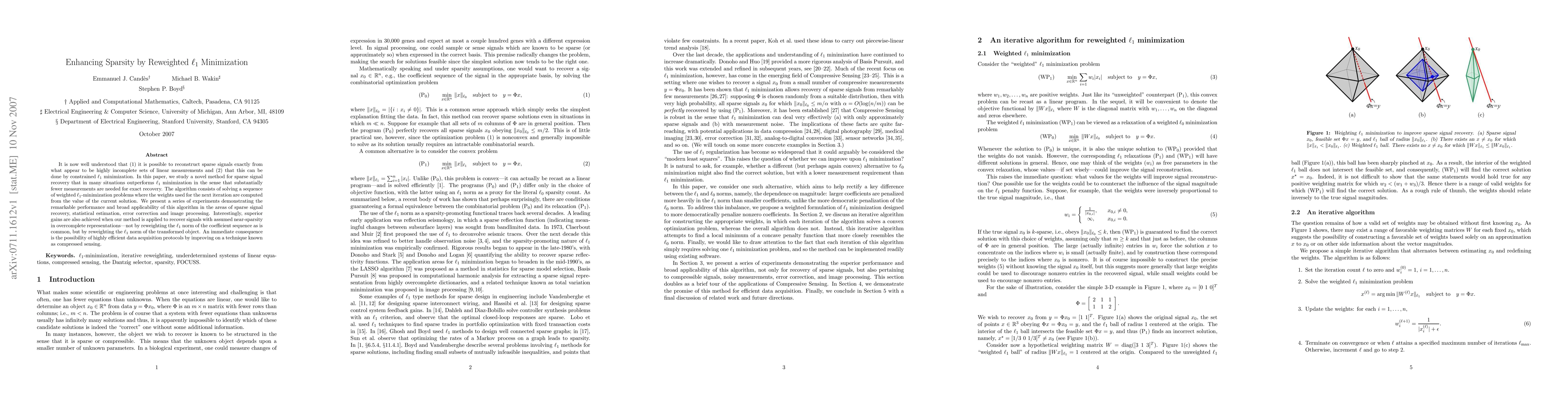 This paper introduces a novel reweighted L1 minimization method for sparse signal recovery, which often requires fewer measurements than traditional L1 minimization for exact reconstruction. The method demonstrates superior performance across various applications, including statistical estimation, error correction, and image processing.