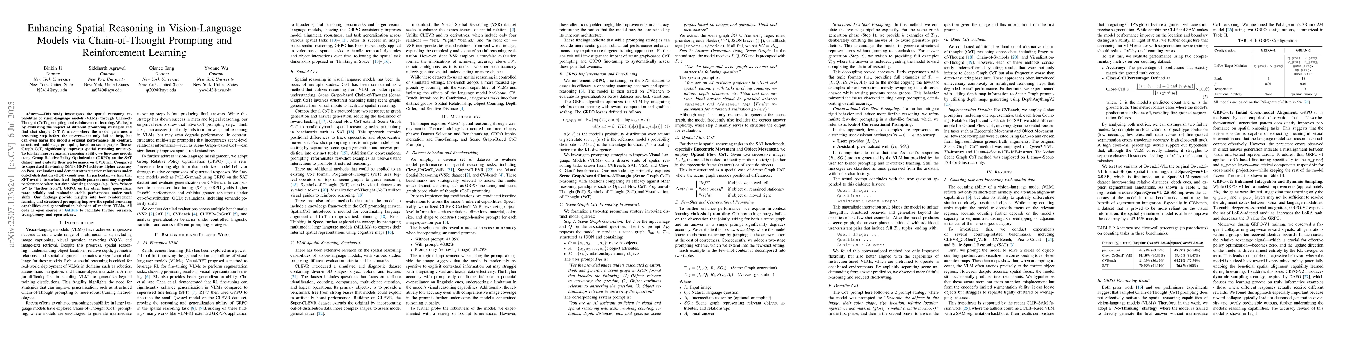 This study investigates the spatial reasoning capabilities of vision-language models (VLMs) through Chain-of-Thought (CoT) prompting and reinforcement learning. We begin by evaluating the impact of different prompting strategies and find that simple CoT formats, where the model generates a reasoning step before the answer, not only fail to help, but can even harm the model's original performance. In contrast, structured multi-stage prompting based on scene graphs (SceneGraph CoT) significantly improves spatial reasoning accuracy. Furthermore, to improve spatial reasoning ability, we fine-tune models using Group Relative Policy Optimization (GRPO) on the SAT dataset and evaluate their performance on CVBench. Compared to supervised fine-tuning (SFT), GRPO achieves higher accuracy on Pass@1 evaluations and demonstrates superior robustness under out-of-distribution (OOD) conditions. In particular, we find that SFT overfits to surface-level linguistic patterns and may degrade performance when test-time phrasing changes (e.g., from "closer to" to "farther from"). GRPO, on the other hand, generalizes more reliably and maintains stable performance under such shifts. Our findings provide insights into how reinforcement learning and structured prompting improve the spatial reasoning capabilities and generalization behavior of modern VLMs. All code is open source at: https://github.com/Yvonne511/spatial-vlm-investigator