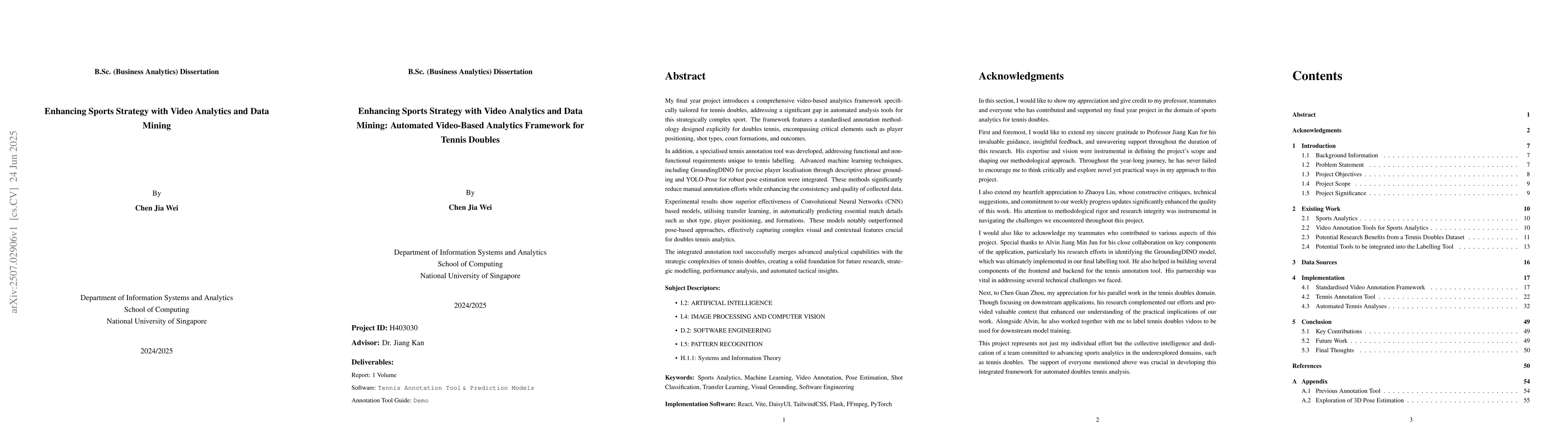 We present a comprehensive video-based analytics framework for tennis doubles that addresses the lack of automated analysis tools for this strategically complex sport. Our approach introduces a standardised annotation methodology encompassing player positioning, shot types, court formations, and match outcomes, coupled with a specialised annotation tool designed to meet the unique requirements of tennis video labelling. The framework integrates advanced machine learning techniques including GroundingDINO for precise player localisation through natural language grounding and YOLO-Pose for robust pose estimation. This combination significantly reduces manual annotation effort whilst improving data consistency and quality. We evaluate our approach on doubles tennis match data and demonstrate that CNN-based models with transfer learning substantially outperform pose-based methods for predicting shot types, player positioning, and formations. The CNN models effectively capture complex visual and contextual features essential for doubles tennis analysis. Our integrated system bridges advanced analytical capabilities with the strategic complexities of tennis doubles, providing a foundation for automated tactical analysis, performance evaluation, and strategic modelling in professional tennis.