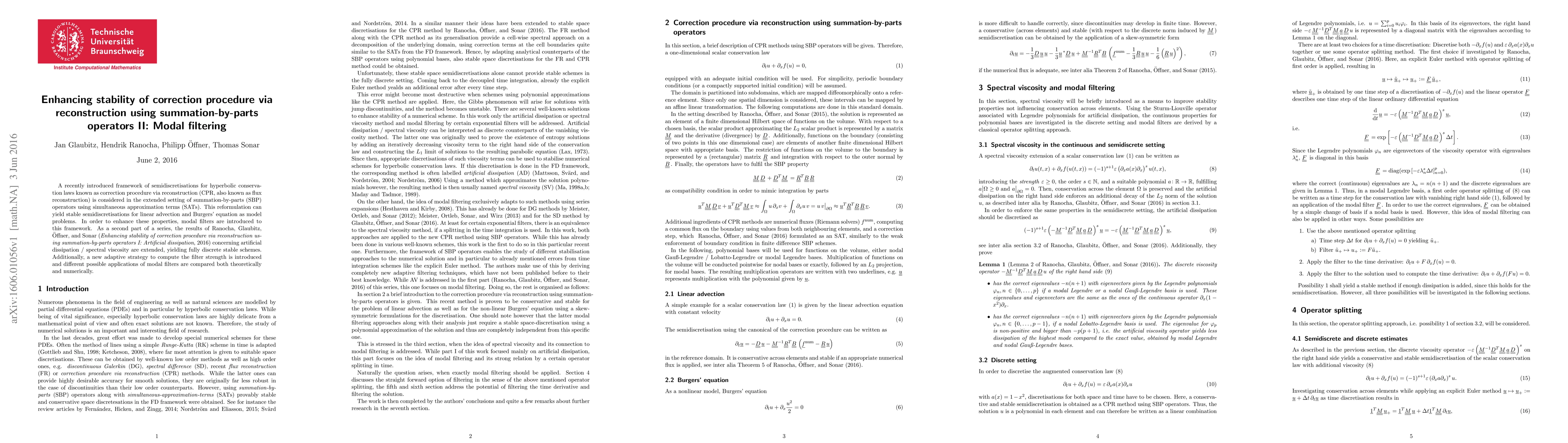 This paper extends the correction procedure via reconstruction (CPR) framework using summation-by-parts (SBP) operators and introduces modal filters to enhance stability. It builds on previous work on artificial dissipation and presents a new adaptive strategy for filter strength computation, demonstrating its effectiveness in achieving stable semidiscretisations.