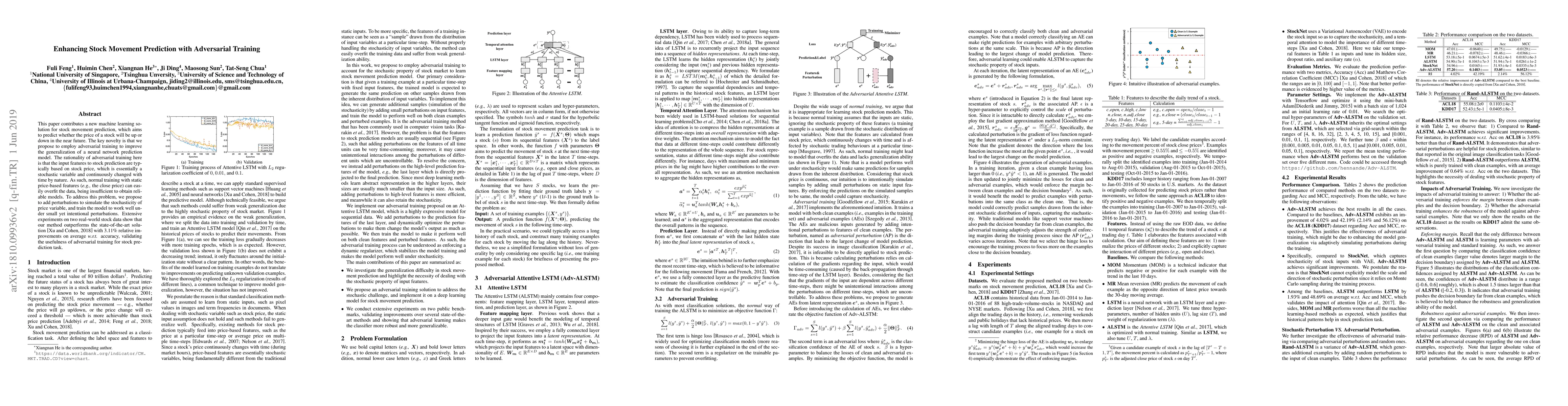 This paper introduces a novel machine learning approach to stock movement prediction using adversarial training to enhance model generalization. The method adds perturbations to simulate the stochastic nature of stock prices, leading to a 3.11% relative improvement in accuracy over existing models.