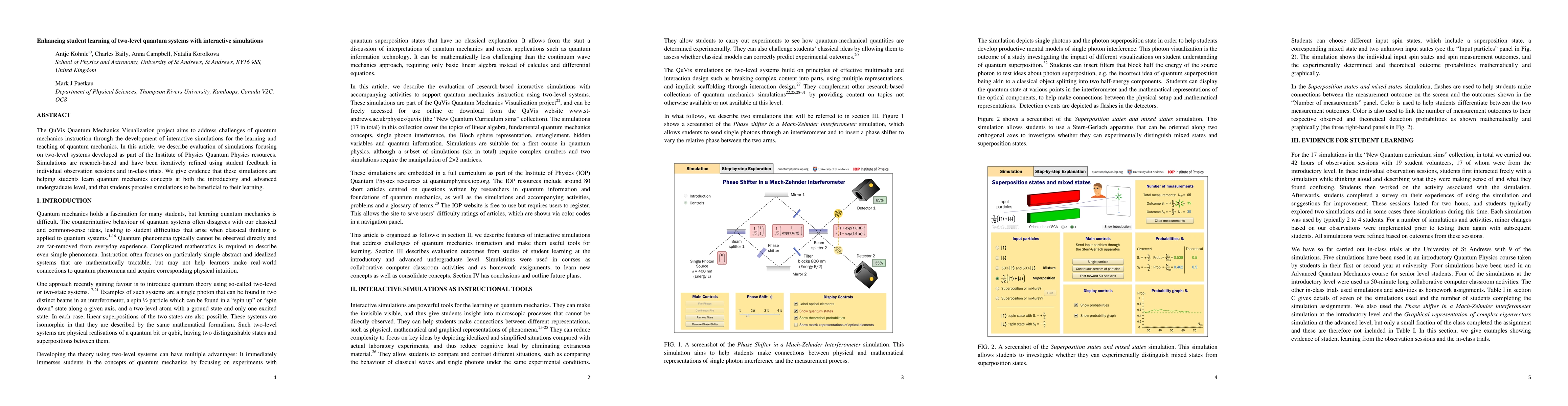 The QuVis Quantum Mechanics Visualization project aims to address challenges of quantum mechanics instruction through the development of interactive simulations for the learning and teaching of quantum mechanics. In this article, we describe evaluation of simulations focusing on two-level systems developed as part of the Institute of Physics Quantum Physics resources. Simulations are research-based and have been iteratively refined using student feedback in individual observation sessions and in-class trials. We give evidence that these simulations are helping students learn quantum mechanics concepts at both the introductory and advanced undergraduate level, and that students perceive simulations to be beneficial to their learning.