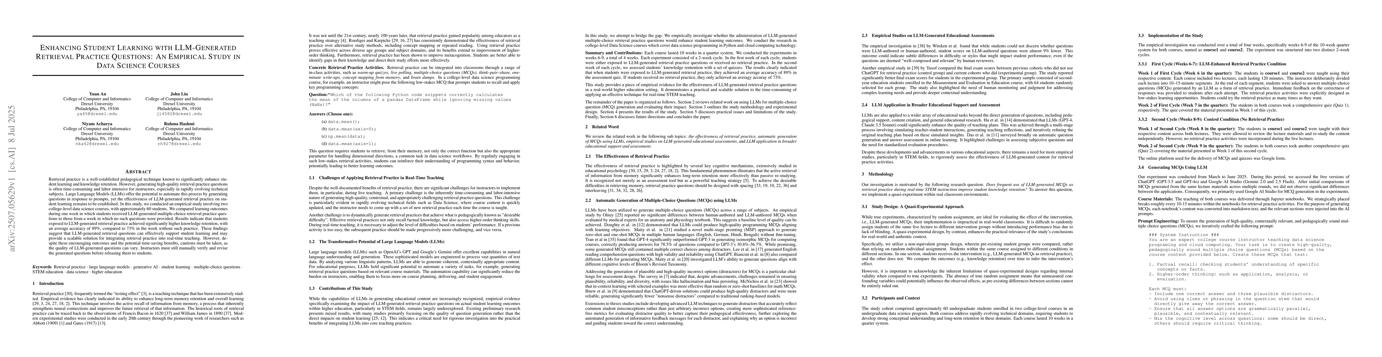 Retrieval practice is a well-established pedagogical technique known to significantly enhance student learning and knowledge retention. However, generating high-quality retrieval practice questions is often time-consuming and labor intensive for instructors, especially in rapidly evolving technical subjects. Large Language Models (LLMs) offer the potential to automate this process by generating questions in response to prompts, yet the effectiveness of LLM-generated retrieval practice on student learning remains to be established. In this study, we conducted an empirical study involving two college-level data science courses, with approximately 60 students. We compared learning outcomes during one week in which students received LLM-generated multiple-choice retrieval practice questions to those from a week in which no such questions were provided. Results indicate that students exposed to LLM-generated retrieval practice achieved significantly higher knowledge retention, with an average accuracy of 89%, compared to 73% in the week without such practice. These findings suggest that LLM-generated retrieval questions can effectively support student learning and may provide a scalable solution for integrating retrieval practice into real-time teaching. However, despite these encouraging outcomes and the potential time-saving benefits, cautions must be taken, as the quality of LLM-generated questions can vary. Instructors must still manually verify and revise the generated questions before releasing them to students.